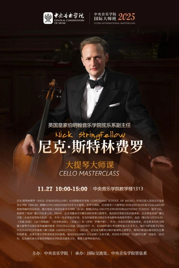 预告|英国皇家伯明翰音乐学院弦乐系副主任尼克·斯特林费罗大提琴大师课