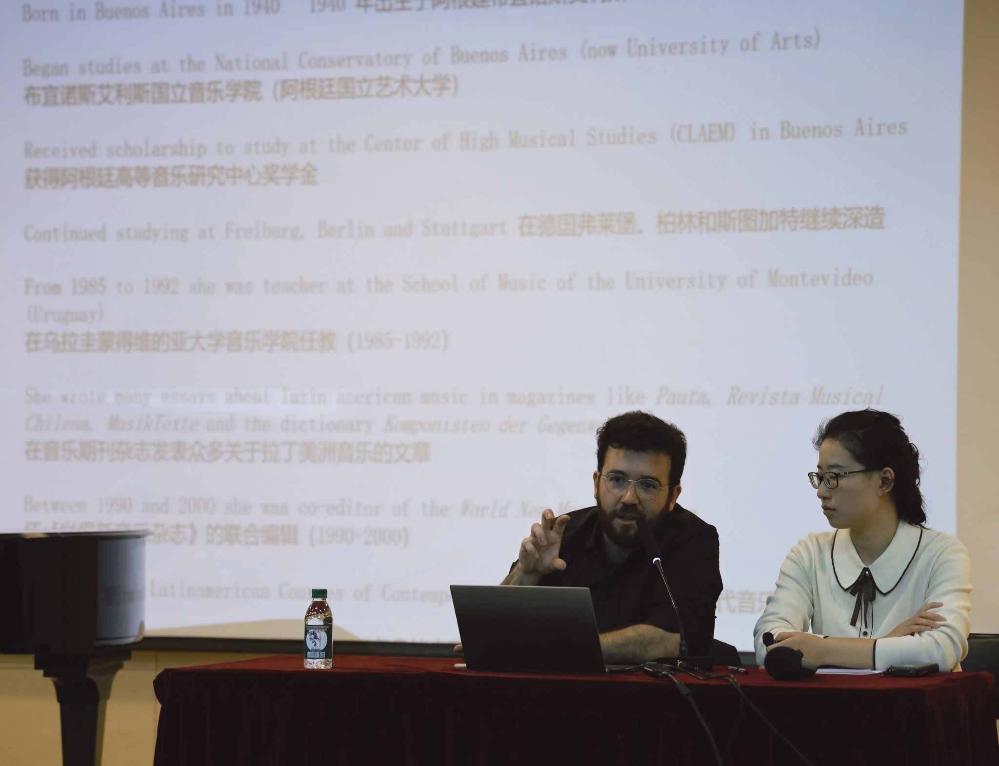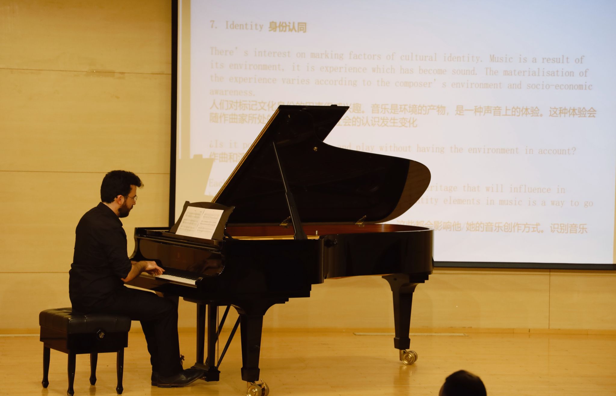 10月15日,阿根廷国立艺术大学音乐与声学艺术学院副院长罗德里戈·埃万杰利斯塔(Rodrigo Evangelista)在KY开元教学楼701演奏厅举办了题为《拉丁美洲音乐创作与身份认同》的学术讲座。他以阿根廷作曲家、音乐学家格雷西拉·帕拉斯卡韦迪斯(Graciela Paraskevaídis)的钢琴作品为例,介绍了众多南美作曲家共同的作曲路径,探究拉丁美洲音乐创作与身份认同之间的关系,分析总结了拉丁美洲现代音乐独有的风格和特点,并现场演奏了部分作品,为校内外师生提供了近距离了解拉丁美洲当代音乐创作的难得机会。