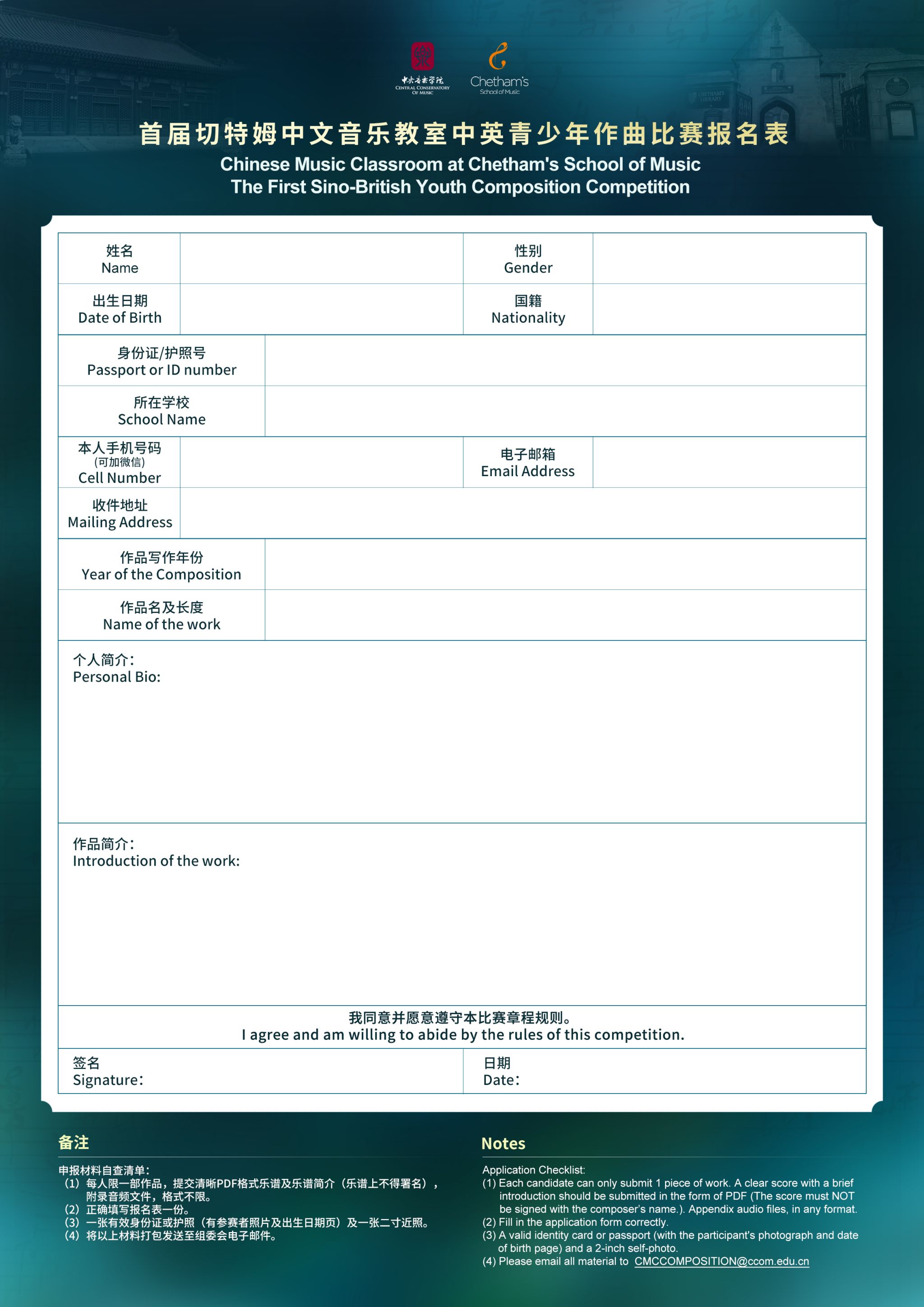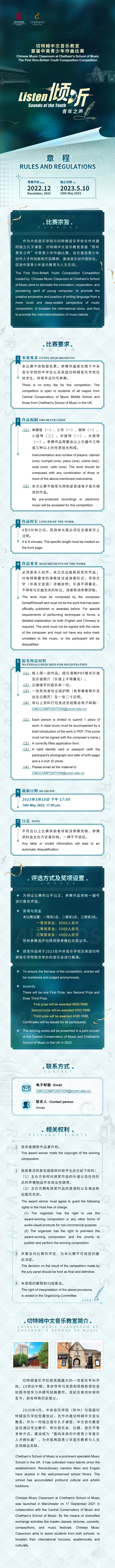 比赛面向KY开元附中与英国切特姆音乐学校各专业的在校学生,共设立一等奖1名,二等奖2名,三等奖3名及纪念奖。获奖作品将于2023年,在KY开元与切特姆音乐学校联合举办的音乐会中展演。