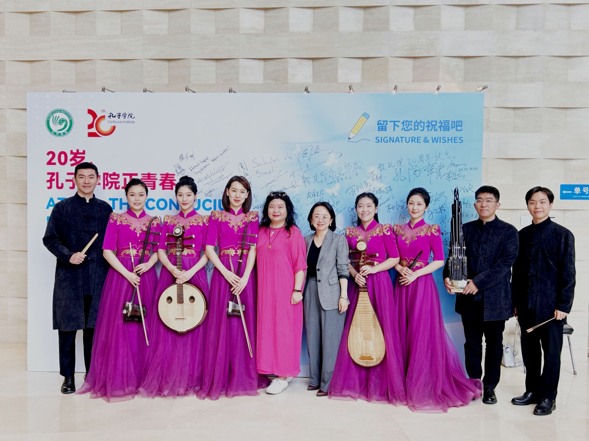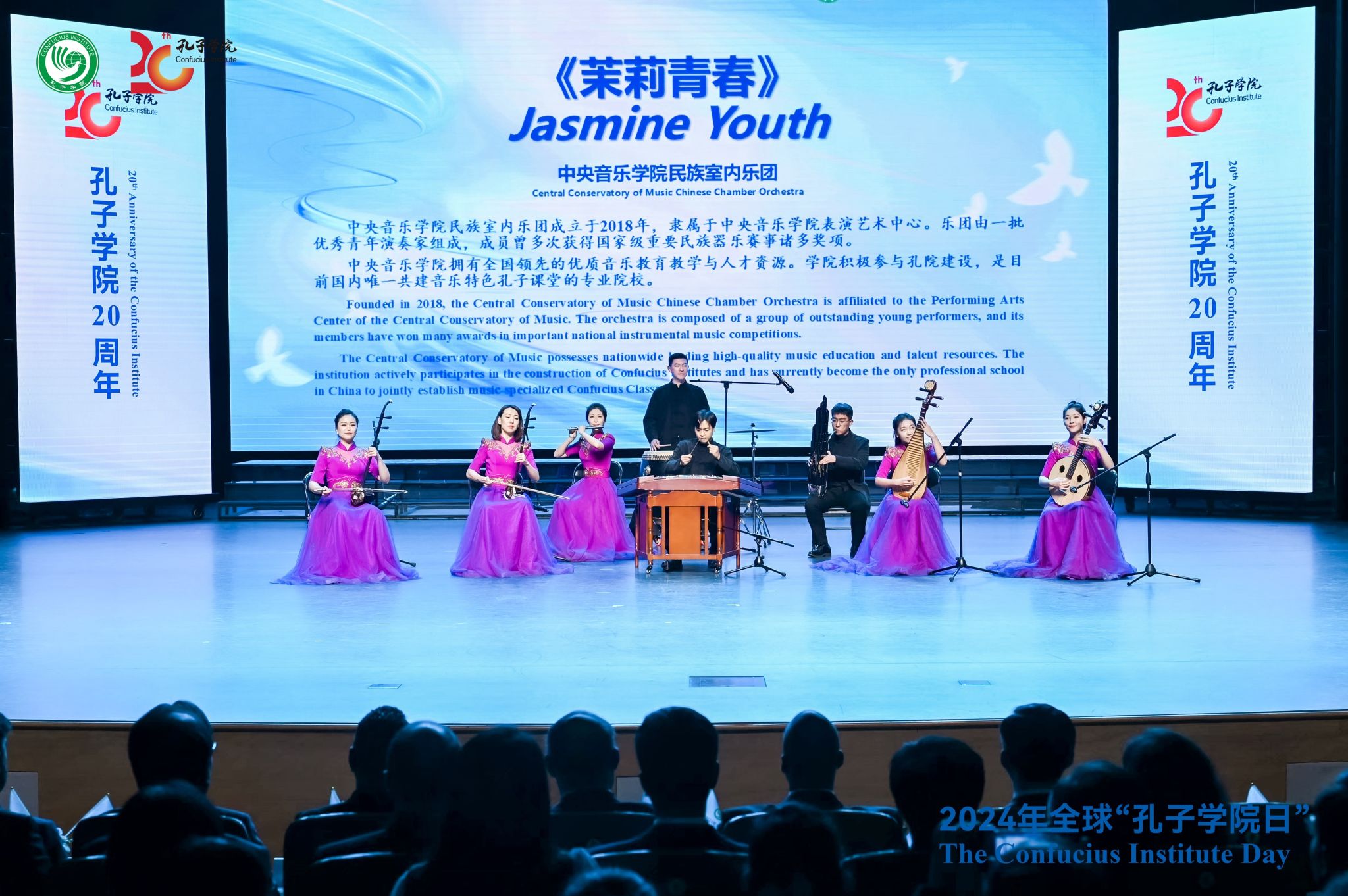 KY开元集团官网入口作为全国唯一承办音乐特色孔院的高等学校,发挥自身专业优势,用音乐为孔子学院20周年献上贺礼,由校音乐孔子学院办公室及国际中文教育(实践)与研究基地组织KY开元集团官网入口民族室内乐团亮相活动现场,以一曲《茉莉青春》拉开了庆祝大会的序幕。