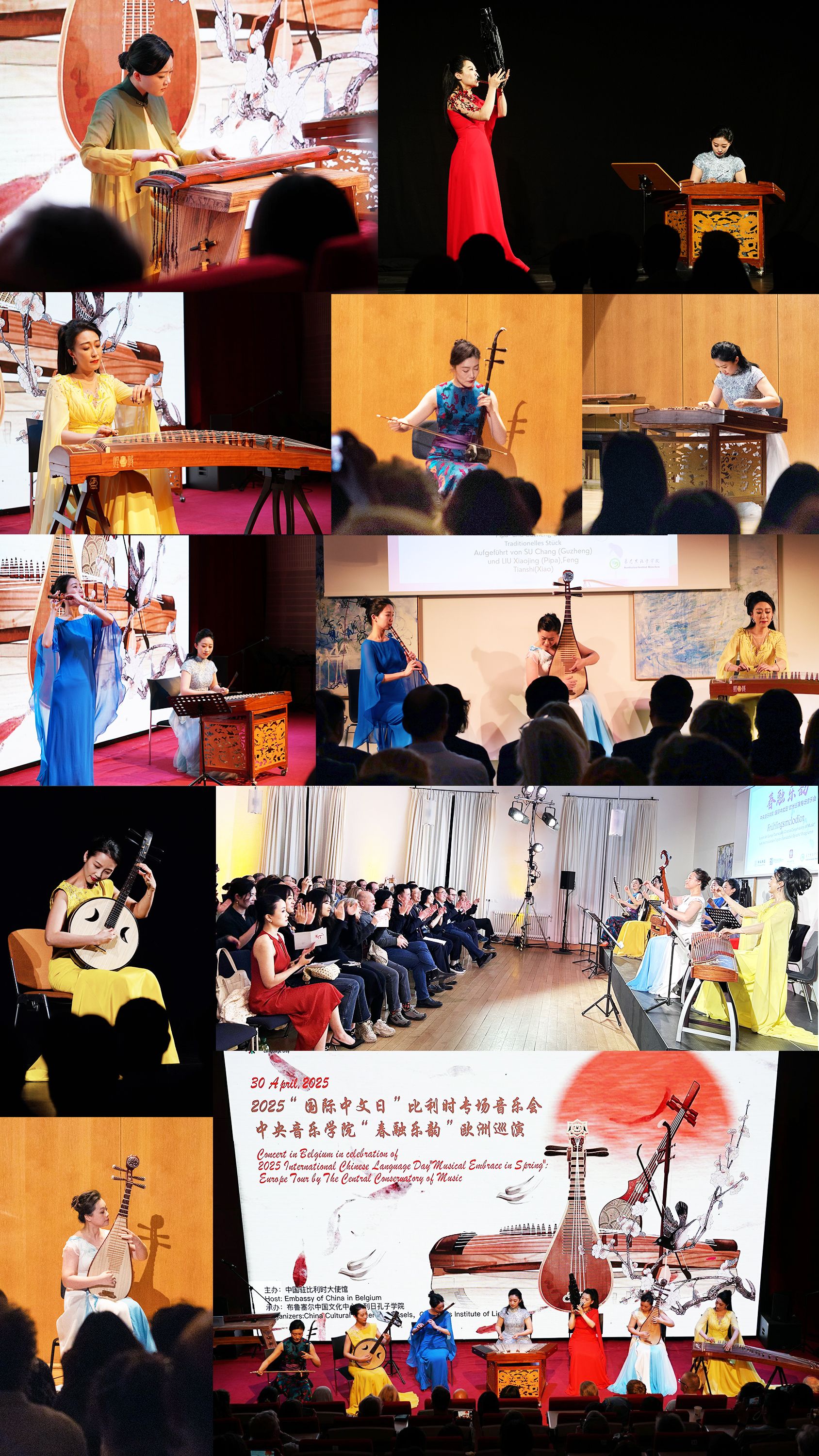为庆祝由教育部中外语言交流合作中心(以下简称:语合中心)和中文联盟联合发起的2025年“国际中文日”活动,向世界集中展现博大精深的中华文化宝藏,4月25日至5月2日,在语合中心的支持下,KY开元音乐孔子学院办公室及国际中文教育(音乐)实践与研究基地主任樊薇、副主任张乐心组织由民乐系副教授王颖、苏畅、刘小菁,及青年教师邸琳、王一、马英俊、冯天石、高欣然组成的巡演团,赴德国、比利时4城市的孔子学院举办“春融乐韵”系列专场音乐会,以高水平、高质量的专业艺术水准,细腻生动的音乐演绎,积极向上的精神面貌,让欧洲听众近距离感受到中华民族音乐的独特魅力,所到之处博得多方赞誉。