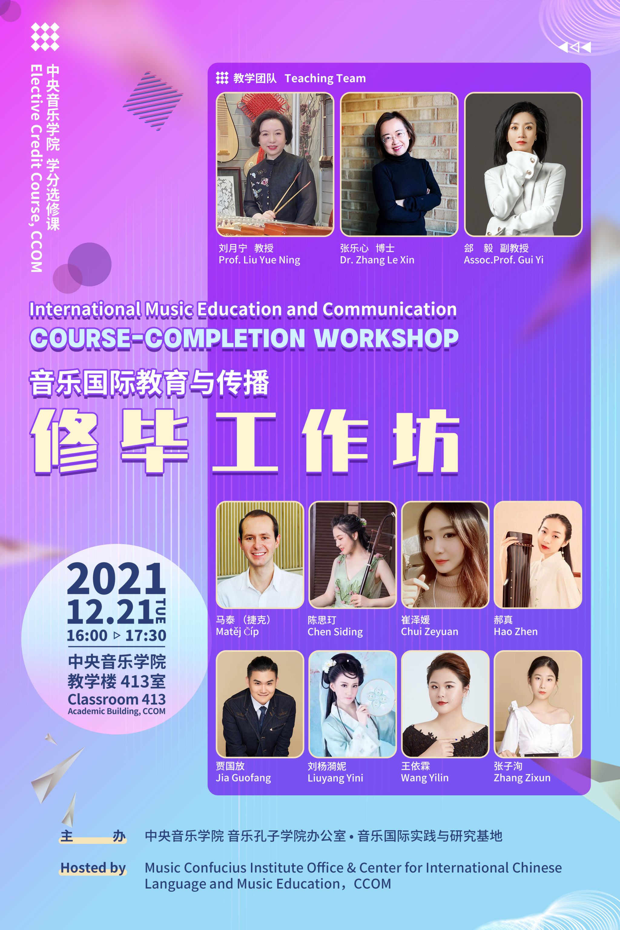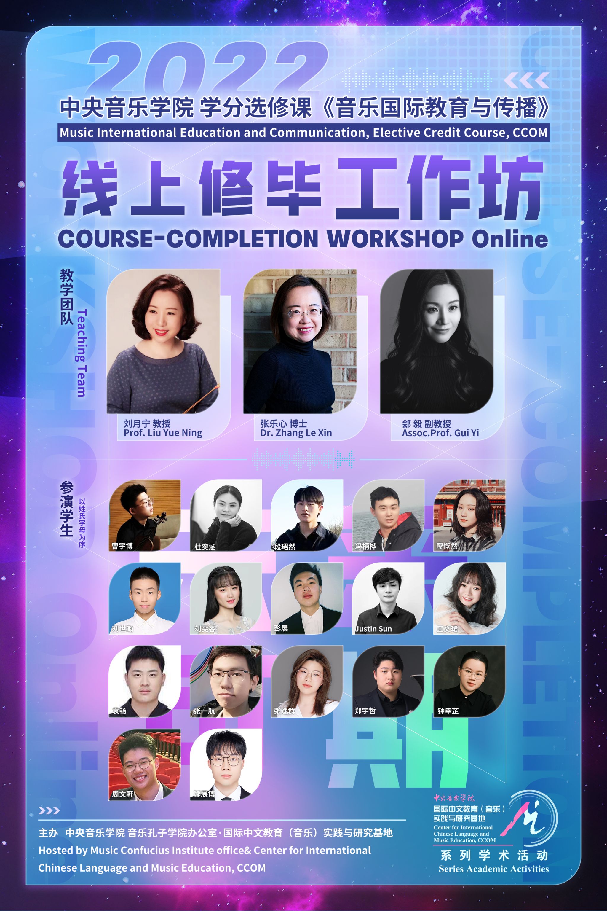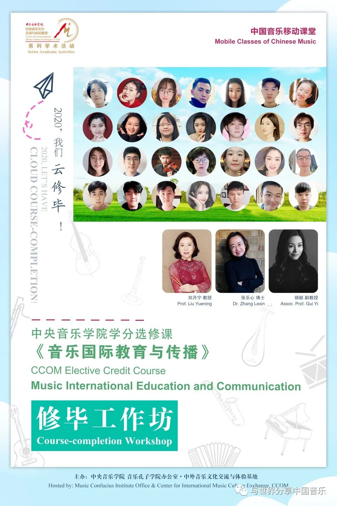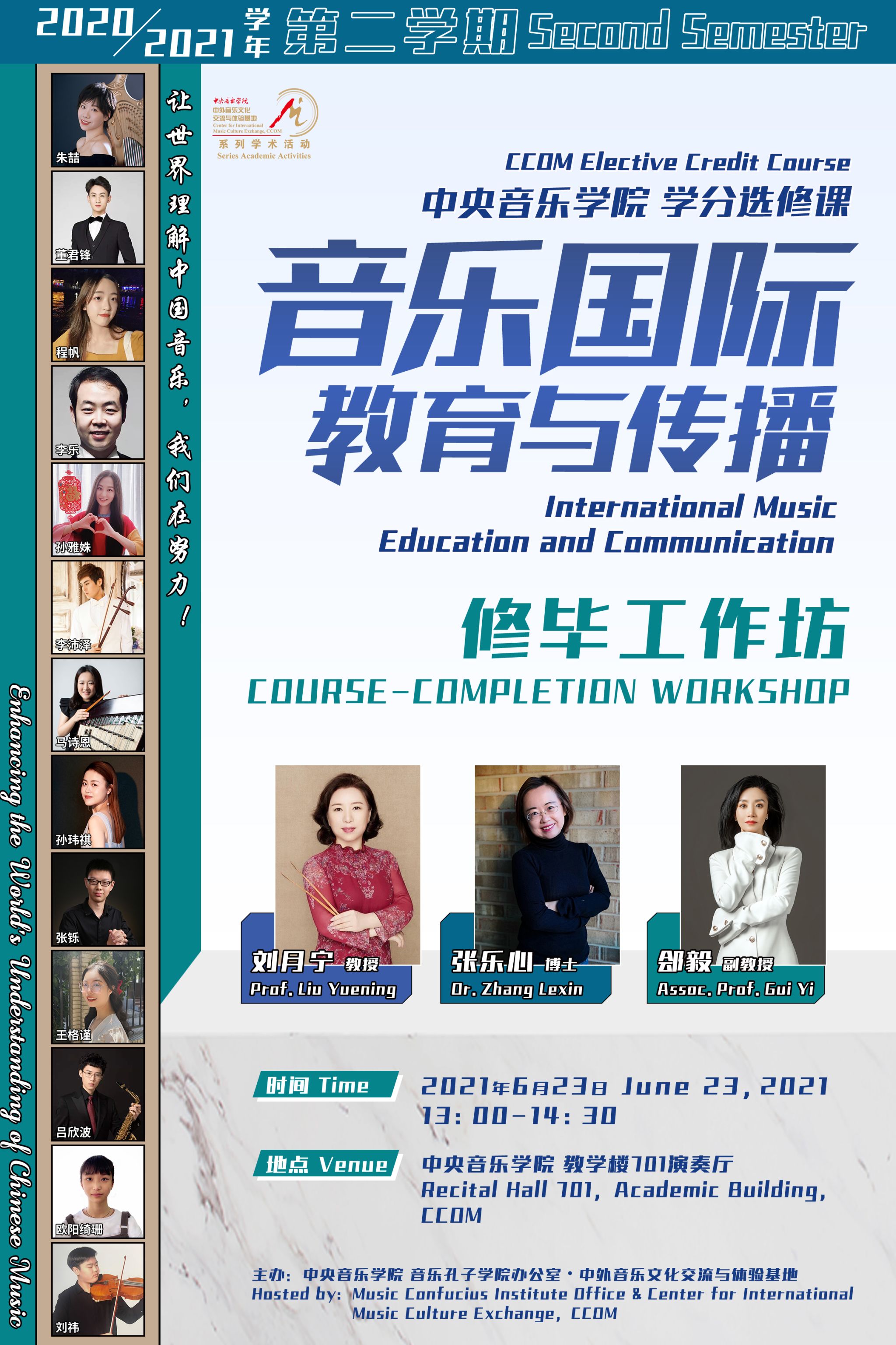 《音乐国际教育与传播》是自2016年起,开设于央音的本、硕联合选修课,由刘月宁教授、张乐心博士、郐毅副教授联合主讲,包含:跨文化交流基础理论、外语、音乐传播历史与现状、当代传播案例分享等多学科内容,旨在培养具备国际教育与传播能力的艺术专业学生,以满足在当前全球性文化交流空前深入的大背景下,对国际化、复合型音乐人才的需求。开设至今,课程已分别面向北京大学燕京学堂、北京航空航天大学国际学院以及中国石油大学国际教育学院留学生们举办了7场线上/线下修毕工作坊活动。