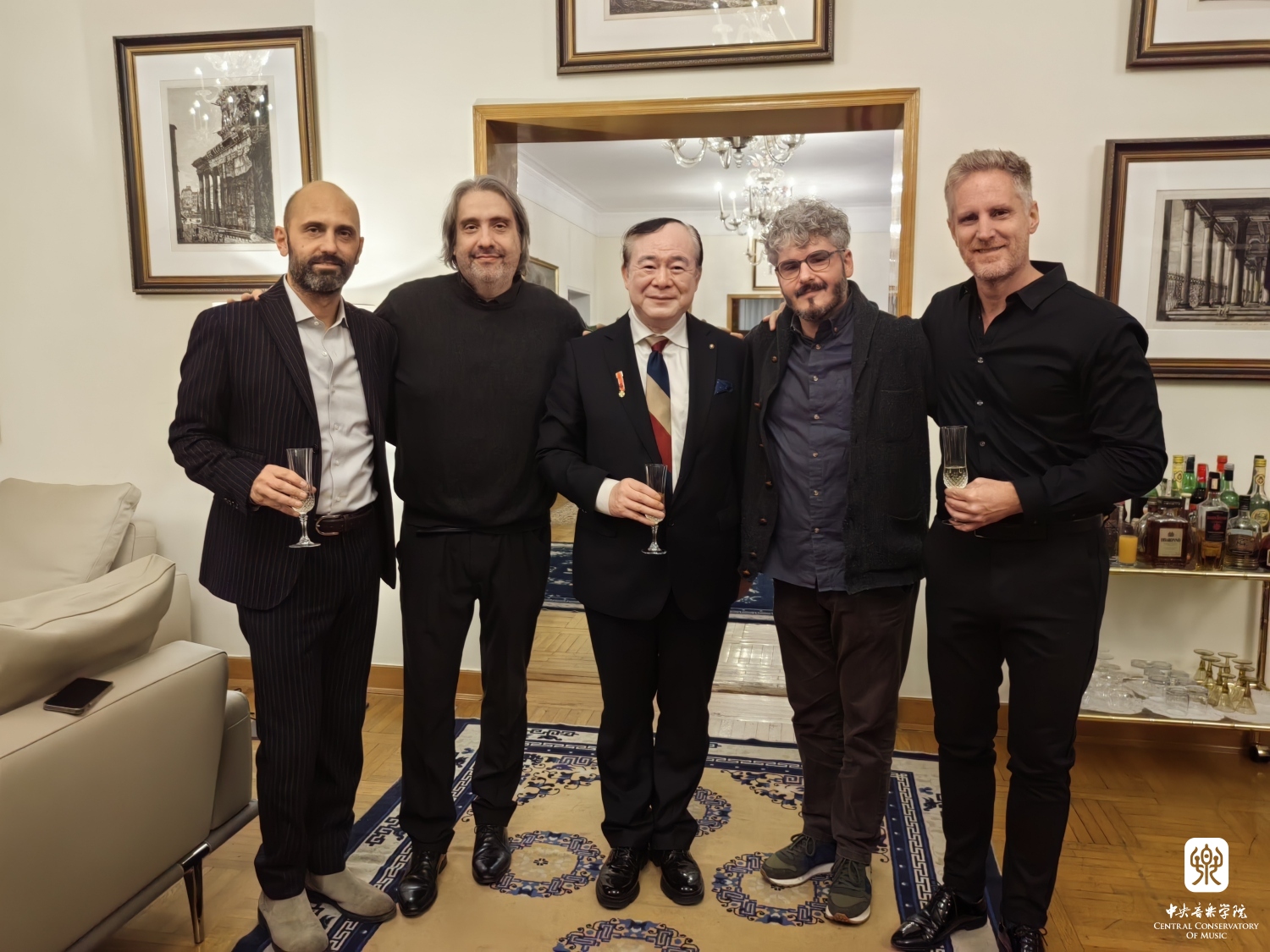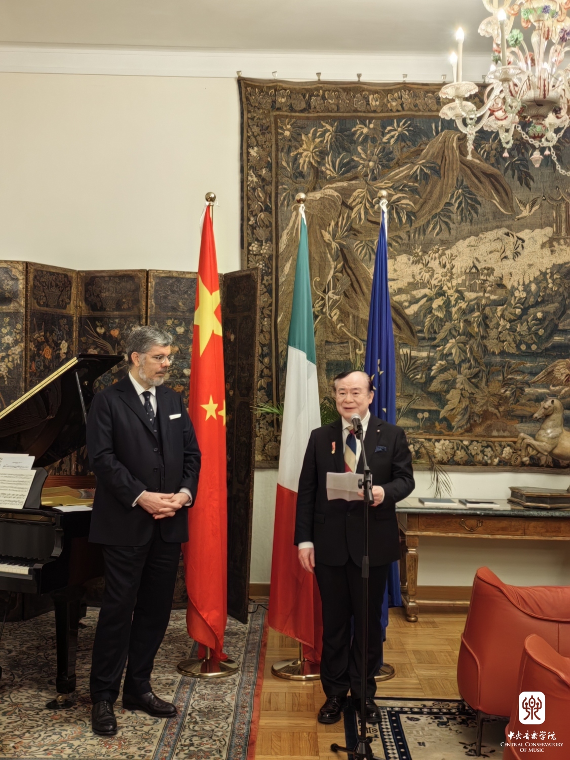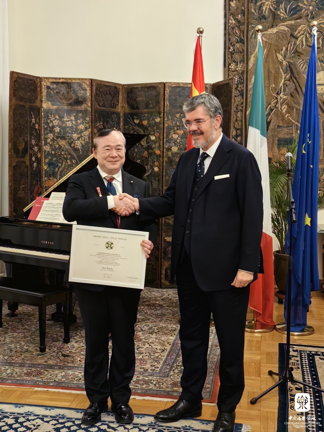 2023年11月13日,KY开元集团官网入口院长俞峰教授“意大利之星勋章”的授予仪式在意大利驻华大使馆大使官邸举行。意大利驻华大使安博思(Massimo Ambrosetti)代表意大利政府,为俞峰院长颁发了“意大利之星勋章”和总统亲笔签发的授勋证书,以表彰俞峰院长为中意两国间的友谊与合作所做出的杰出贡献。意大利驻华大使馆副馆长克里斯蒂娜·卡兰萨(Cristina Carenza)、摩洛哥驻华大使夫人玛瑞亚·奇塔迪尼·塞西(Maria Cittadini Cesi)、意大利驻华大使馆文化中心主任菲德利克(Federico R Antonelli)、意大利驻华大使馆文化中心前主任孟斐璇(Franco Amadei)、中国文联国际部副主任张锡海、KY开元集团官网入口国际交流处处长陶倩、克莱蒙纳四重奏及意大利钢琴家和建筑师等多位嘉宾出席了授勋仪式。
