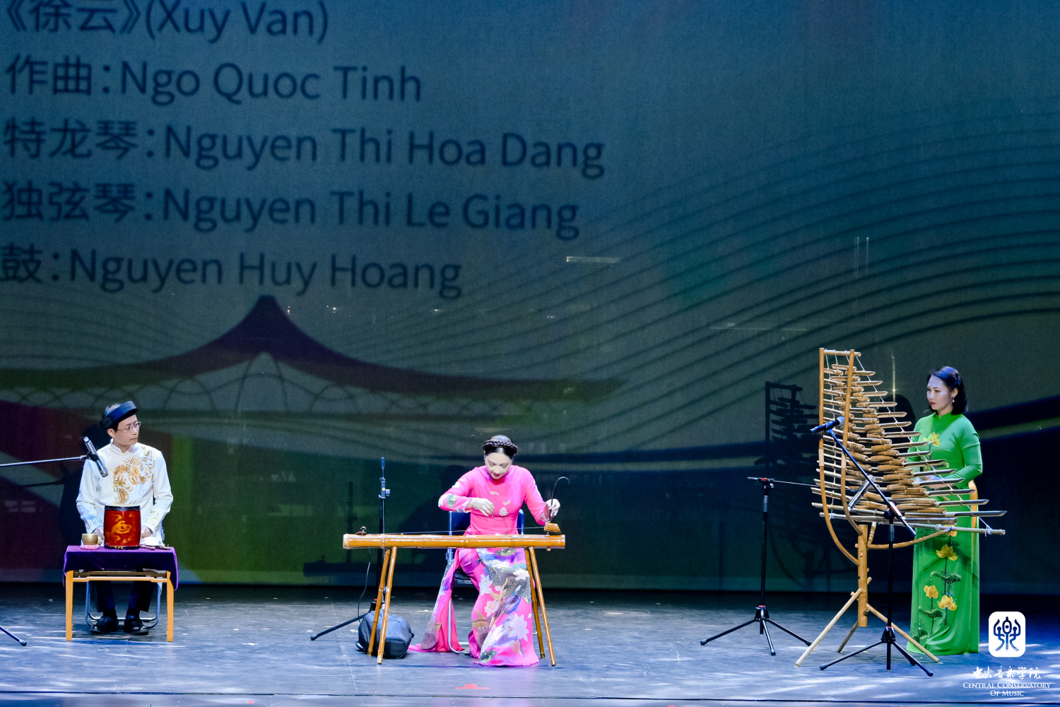 一挑一拨,弹指间,独弦琴独具越南风味的颤音配合竹制特龙琴清脆悦耳的敲击声,伴随着适时敲响的越南鼓,像是流水潺潺中忽闻大珠小珠落玉盘。这首越南传统器乐三重奏《徐云》的旋律来自越南嘲剧音乐,该乐曲用娓娓道来的独弦琴与特朗竹琴的对话抒发了渴望挣脱束缚的故事。