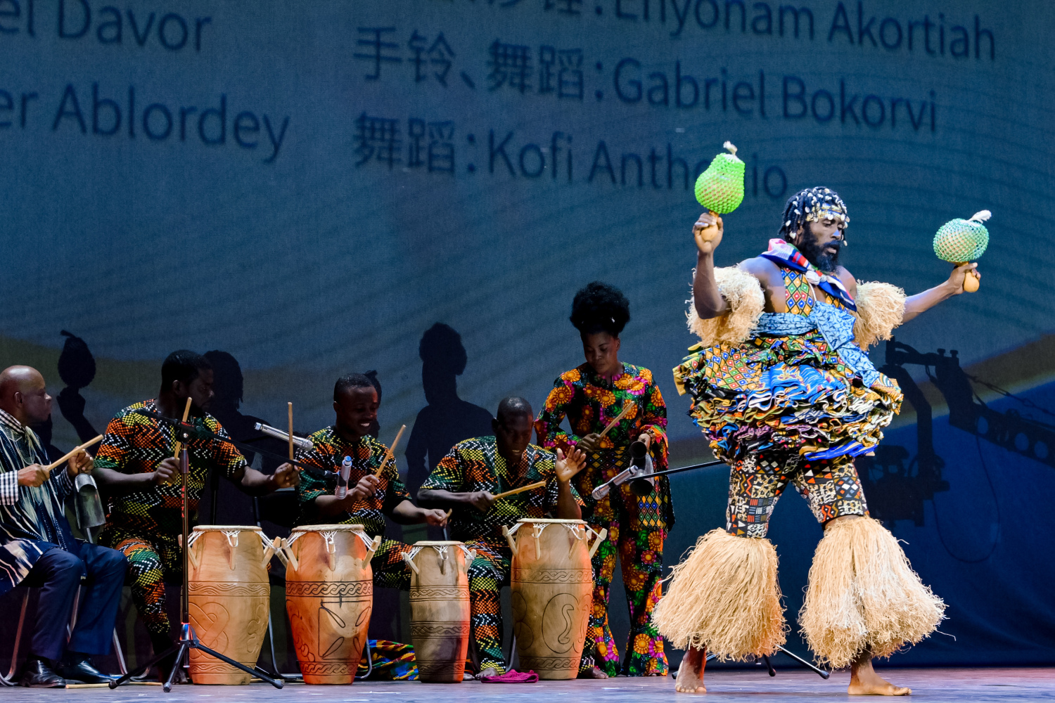当来自加纳的音乐家们赤着脚,舞步灵动游走舞台,一场无与伦比的非洲音乐盛筵就开始了。《加纳鼓舞》鼓乐队流动多变的强烈节奏是加纳音乐的力量,艺术家们身着鲜艳灿烂的特色民族服饰,舞步结合了矮人的步态舞《Kpatsa》与安洛埃维人的《Gahu》舞。默契的配合,不仅仅存在于舞台之上,这股来自加纳的热情,如火般点燃了观众,在全场的互动中似乎已然身临非洲加纳奇境。
