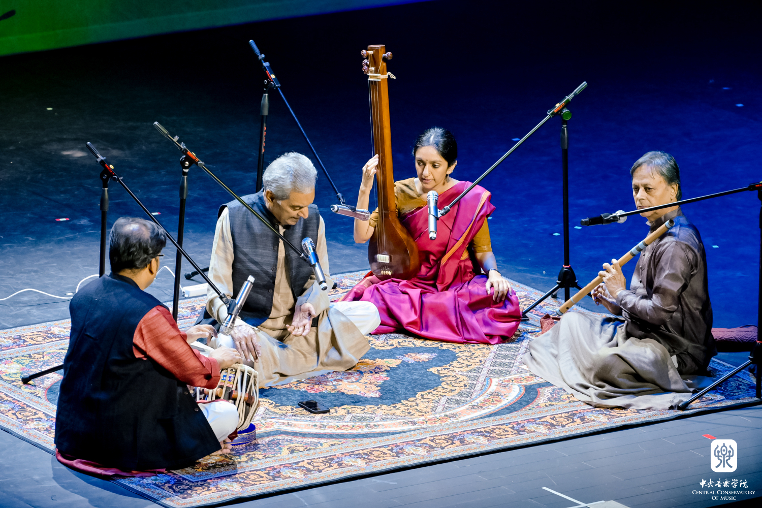 低吟浅唱中,《什里拉格》这首演绎于傍晚时分的传统印度古典声乐作品轻轻撩拨着观众们的感官。舞台上,音乐家们席地而坐,印度传统乐器坦普拉、班苏里的持续音响起,一股来自印度的氤氲便萦绕开来。塔布拉鼓磁性浑厚的鼓点响起,在循环16 拍节奏圈的基础上用各种富于装饰的旋律发展的手法,音乐家们偶尔相视一笑,在即兴演绎中如痴如醉。