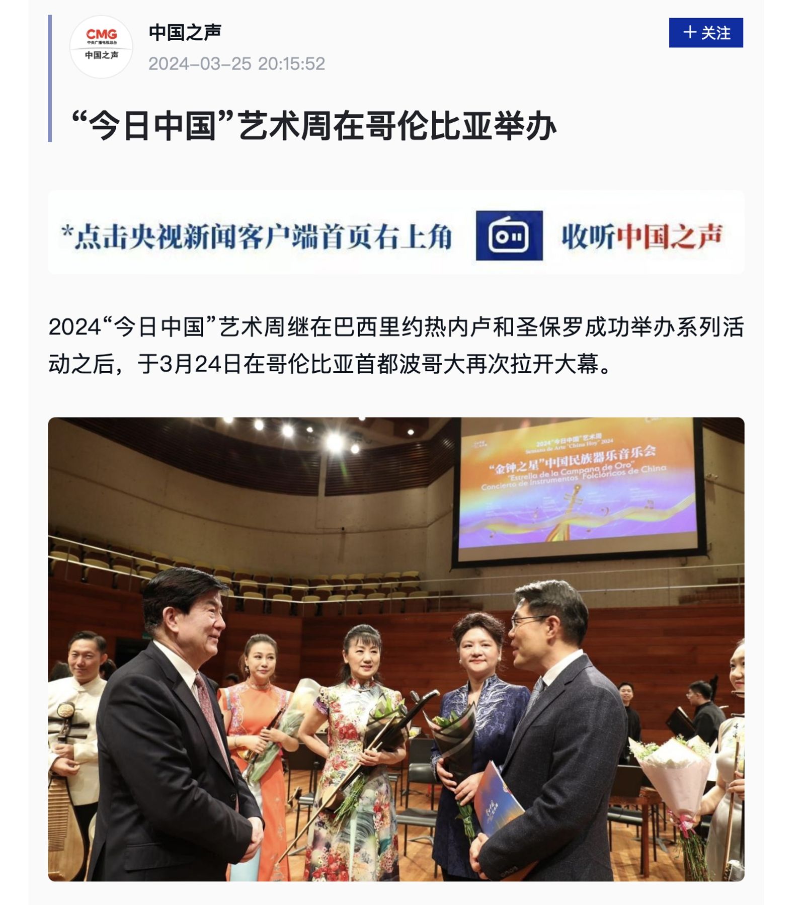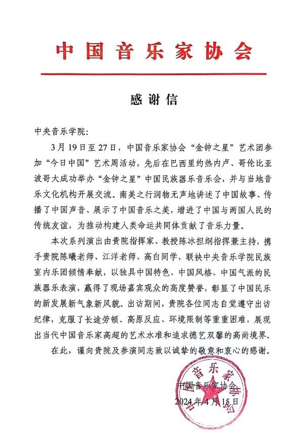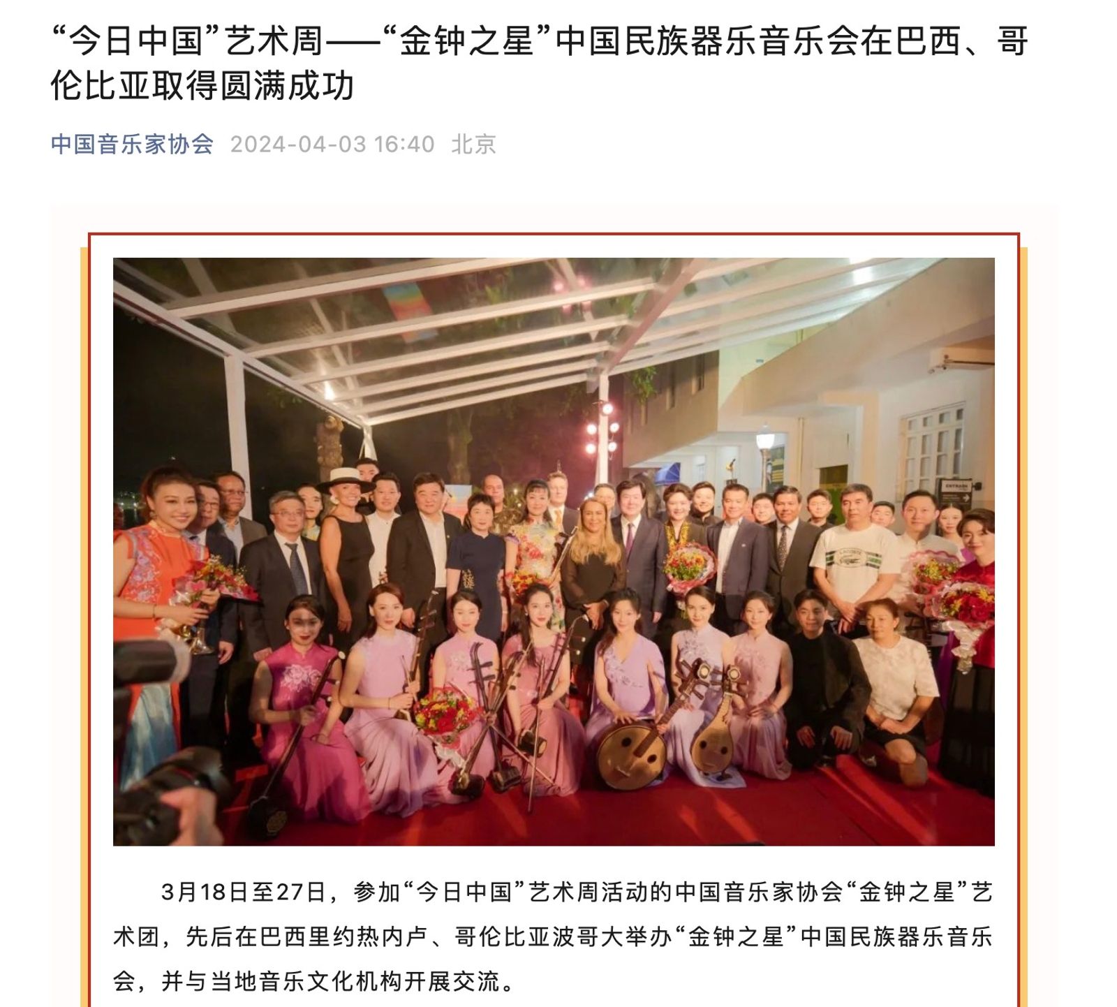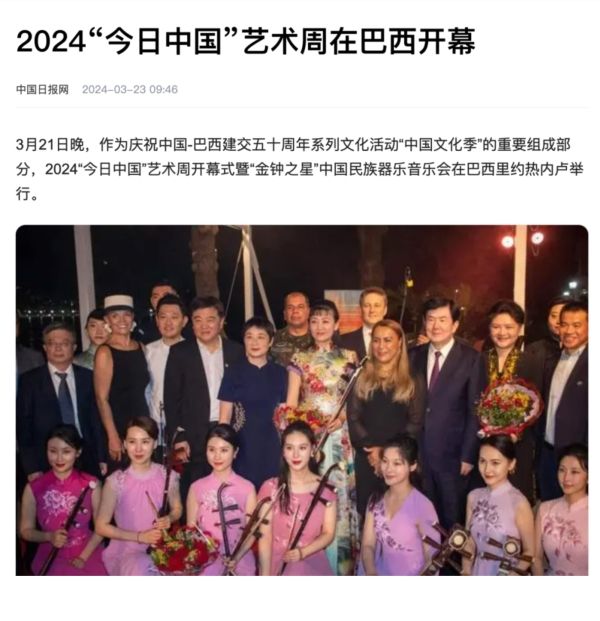 近日,中国文联“今日中国”艺术周——“金钟之星”中国作品音乐会,在巴西里约热内卢、哥伦比亚波哥大两地成功举办!