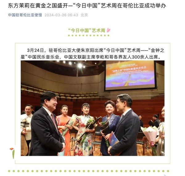 在中国驻哥伦比亚大使馆大力支持下,应哥伦比亚文化部邀请,中国音协“金钟之星”艺术团的艺术家代表赴哥伦比亚国家艺术中心开展座谈活动。中国驻哥伦比亚大使馆代表,中国音协“金钟之星”艺术团代表,同哥伦比亚文化部资深顾问、新文化音乐学院院长豪尔赫·索萨,哥伦比亚文化部代表、国际合作司中国事务主管亚历杭德拉,以及哥伦比亚10余家音乐文化机构的25位音乐家代表,就民族音乐传承发展、国际音乐交流、国家音乐活动、音乐人才培养等议题进行座谈交流。哥方现场即兴表演了传统音乐“班布科”等弹唱节目,赢得在场嘉宾的热烈喝彩。