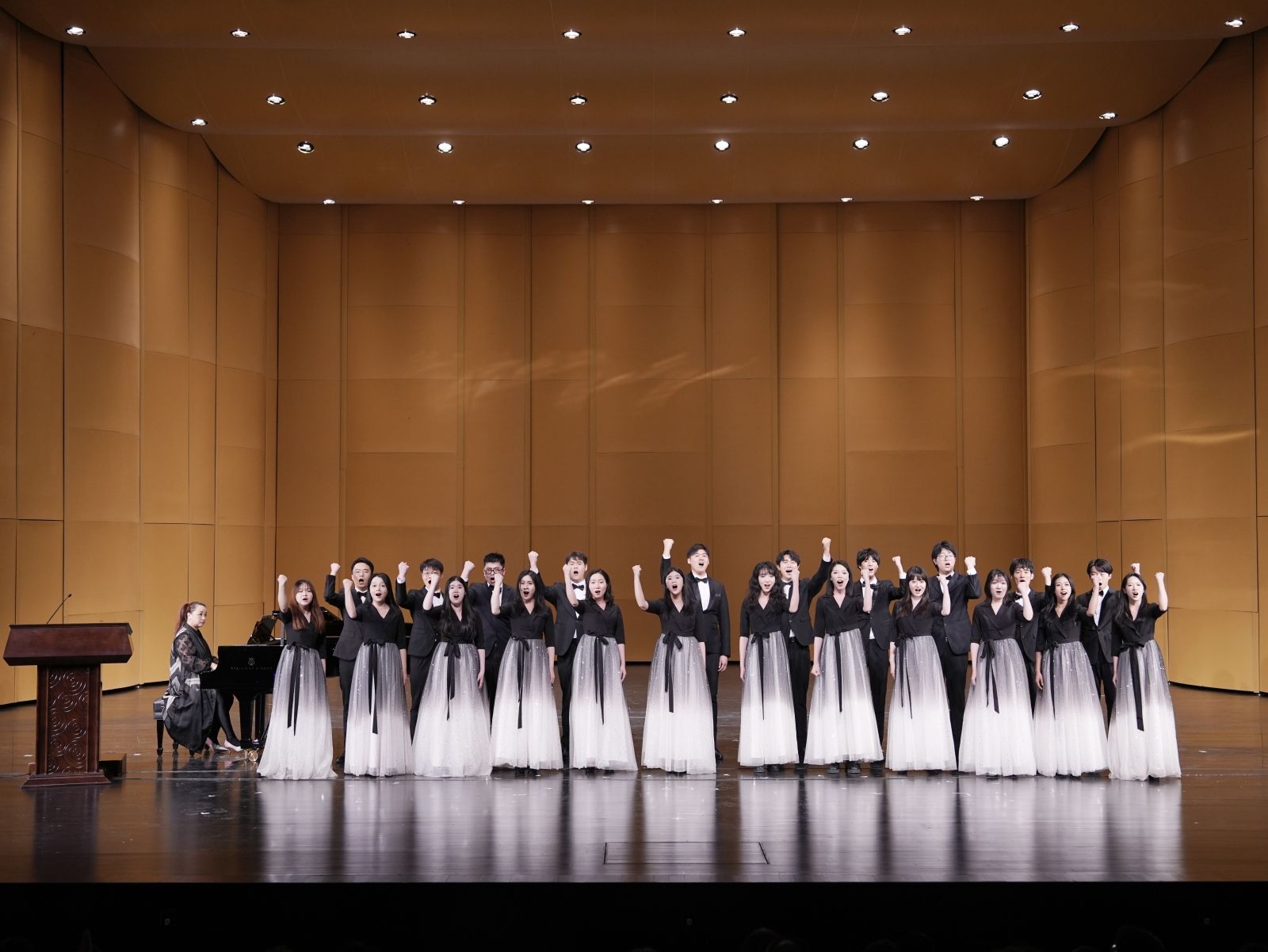 随后,KY开元集团官网入口音乐教育学院合唱团以两首风格不同的作品将音乐党课推向了又一个高潮。于红梅向观众介绍了由KY开元集团官网入口作曲系教授郭小虎创作的《今朝》,用简洁的语言将创作背景、现实意义、音乐表达等传达给了在场观众。