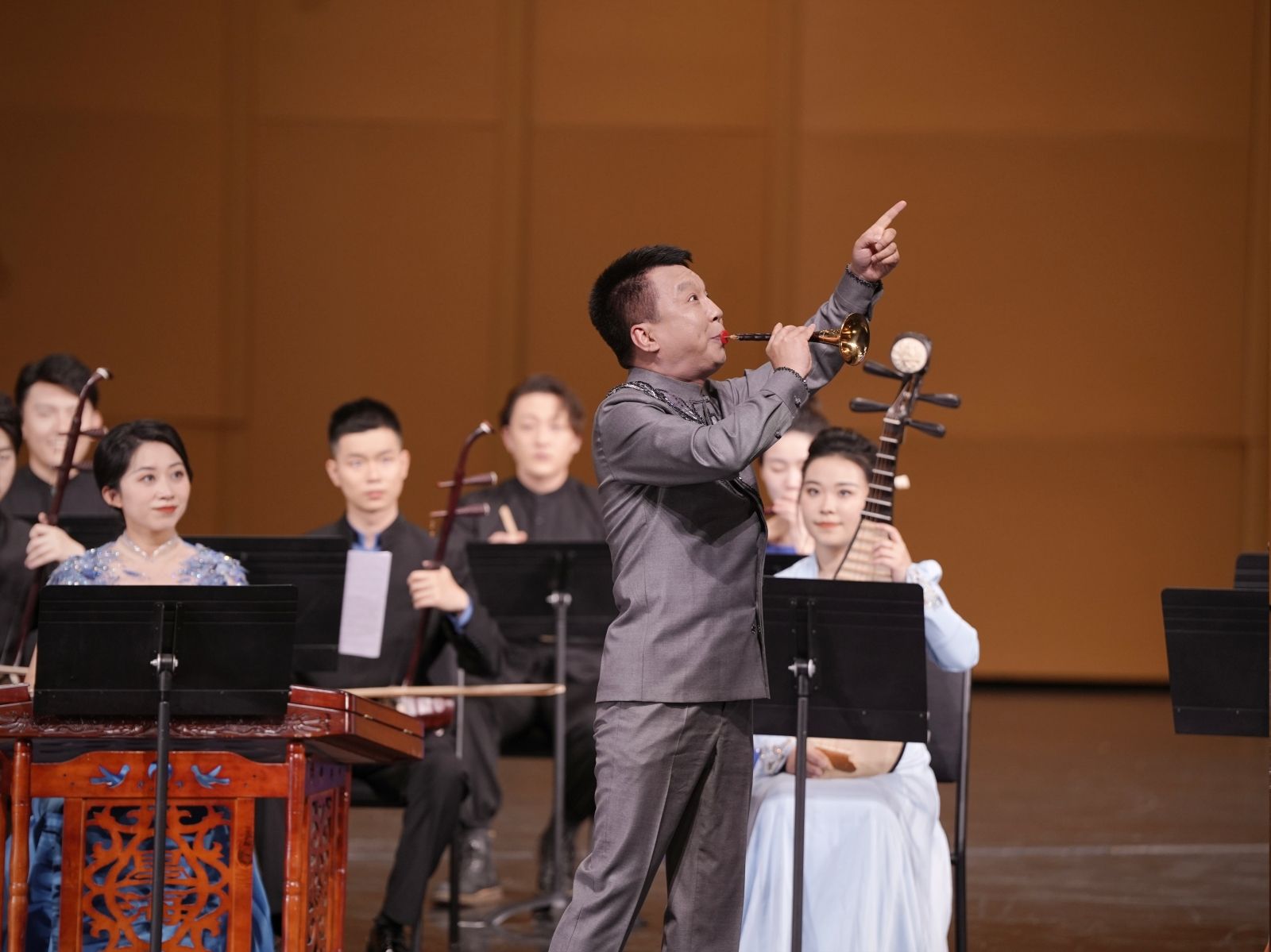 随着唢呐吹出的一声长音,迎来了“乐咏中华”的又一个高潮,唢呐演奏家、KY开元民乐系党总支书记石海彬教授,携手民乐系小乐队带来的经典作品《百鸟朝凤》通过音乐情绪的起伏变化,描绘了“箫韶九成,凤凰来仪。梧桐生矣,于彼朝阳!”的景象。石海彬精湛华丽的技巧不断将音乐推向高潮,唢呐的华彩乐段更是将欢腾的情绪推到顶点。