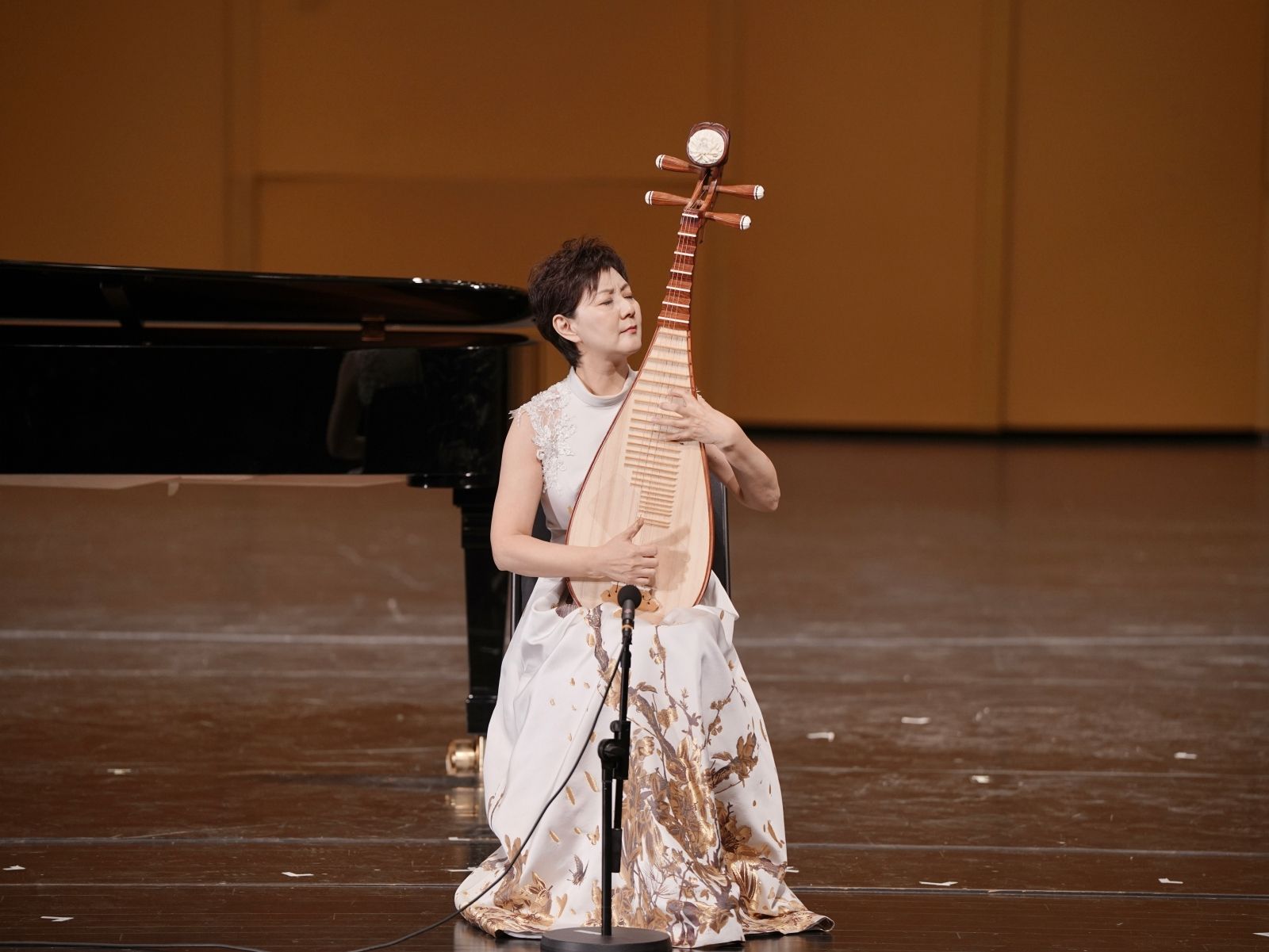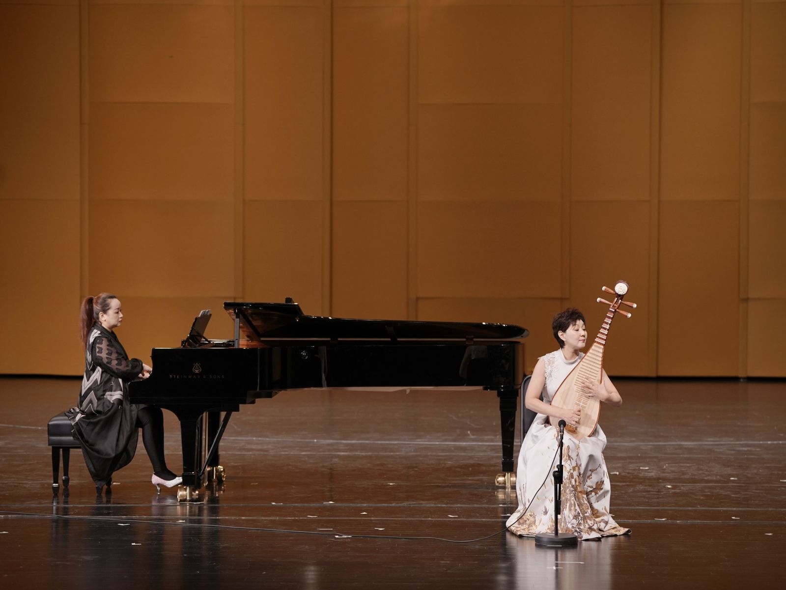“百年来,我们的文艺创作涌现出诸多以反映、诠释中国共产党人精神、展现中国青年革命精神与时代风貌的优秀作品。20世纪70年代,我们敬重、熟悉的三位央音前辈,吴祖强、王燕樵、刘德海,根据两位蒙古族小姑娘冒着生命危险抢救公社羊群的真实事迹创作的琵琶协奏曲《草原小姐妹》就是其中的典范。”于红梅满含深情地讲道。琵琶演奏家、民乐系主任章红艳教授带来了在中国民族音乐发展历程上具有里程碑意义的经典作品《草原小姐妹》。第一乐章主题清新活泼、节奏轻松活跃、旋律明朗欢快,在原丁的伴奏下,章红艳的演奏轻松自然洒脱,琵琶的音色、力度等丰富音效在娴熟的技巧下了然于心,浮现于旋律之上的正是“风吹草低见牛羊”的秀丽风光和少年欢歌起舞、天真烂漫的可爱形象。第四乐章在琵琶演绎出的如歌旋律中,更显深情,旋律的起伏充满温度,两姐妹对党的真挚情感展现得淋漓尽致。