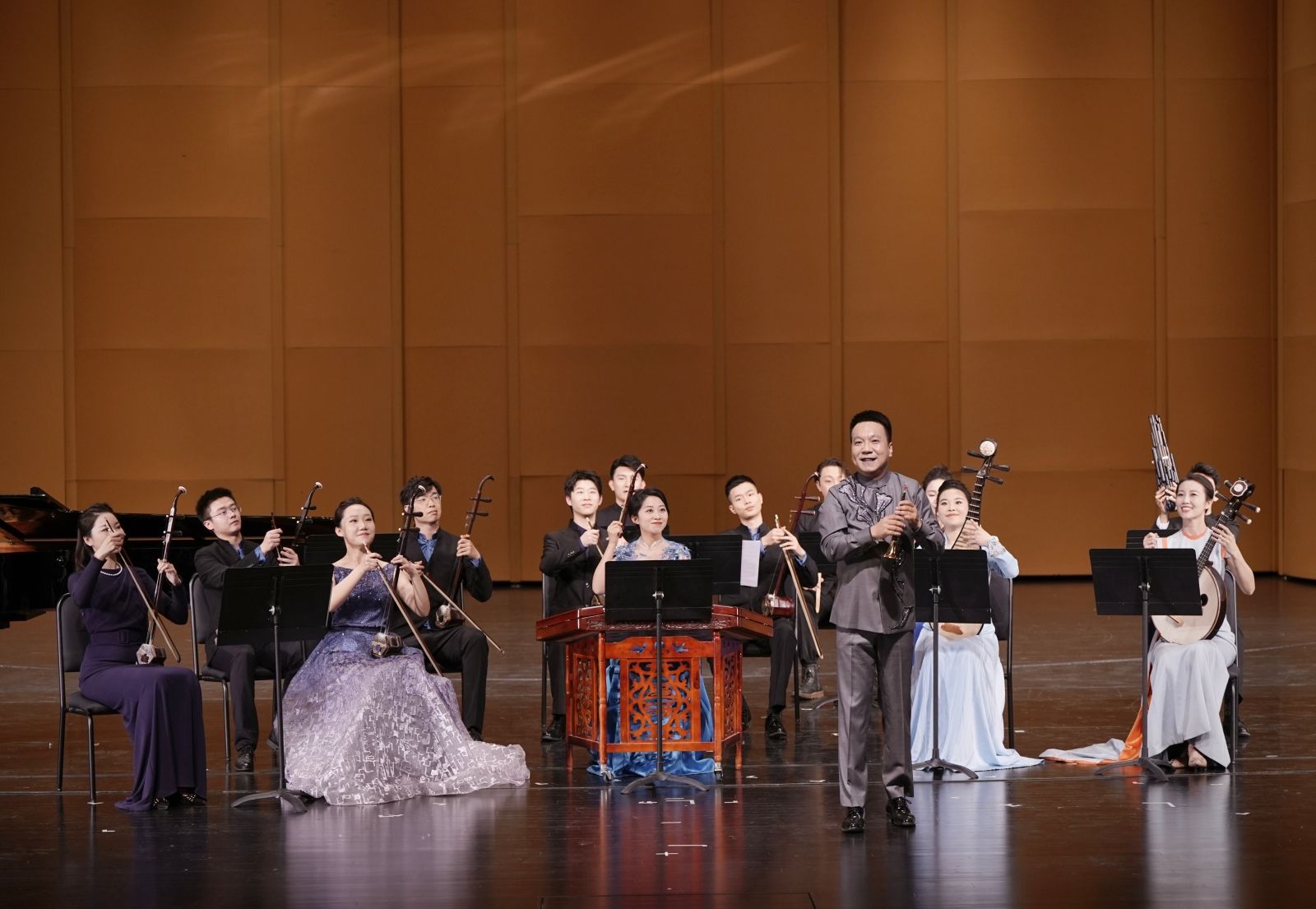 曲目选择上,以历史聚人心,以今朝塑风骨。历史与当代的对话,让传统文化向我们款款走来;音乐与语言的结合,让红色血脉永续传承。13首作品缀连成“诗”。既有百鸟朝凤、万马奔腾的壮观景象,也有传承精神、汲取力量的如磬初心;既有文化交流、文明互鉴的和谐乐章,也有直抒胸臆、质朴表白的深情礼赞。从民乐合奏《光明行》的勃勃英气,到钢琴协奏曲《黄河》的波澜壮阔;从古琴《流水》的涓涓细流,到民族室内乐《敦煌》的气势磅礴,曲曲精选,