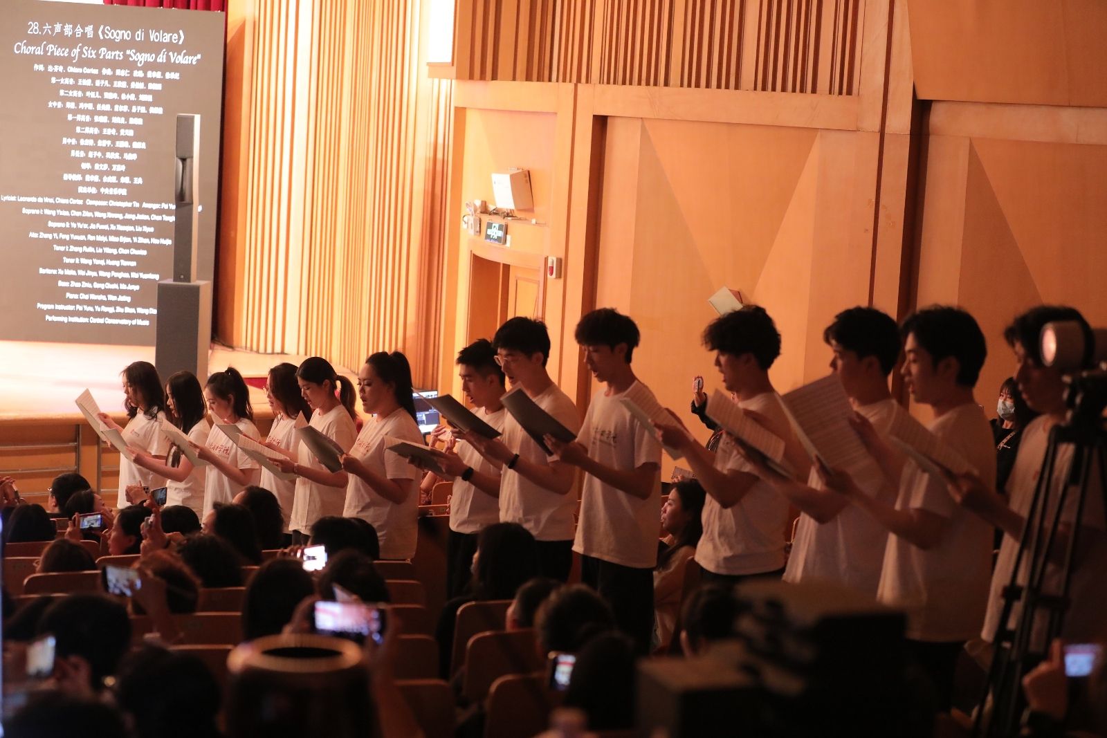 压轴节目由“东道主”KY开元集团官网入口声乐歌剧系一至三年级的学生们排练两次后进行呈现,展示了声乐歌剧系视唱练耳课教学改革成果。这是一首改编自游戏“文明6”主题曲的六声部合唱《Sogno di Volare》。该作品和声效果空旷、浩瀚,演绎出宏大的史诗感,整场音乐会也在如此壮丽的音乐中准备迎接落幕。这首曲目的恢弘气势也表达出对视唱练耳学科发展的远大愿景。