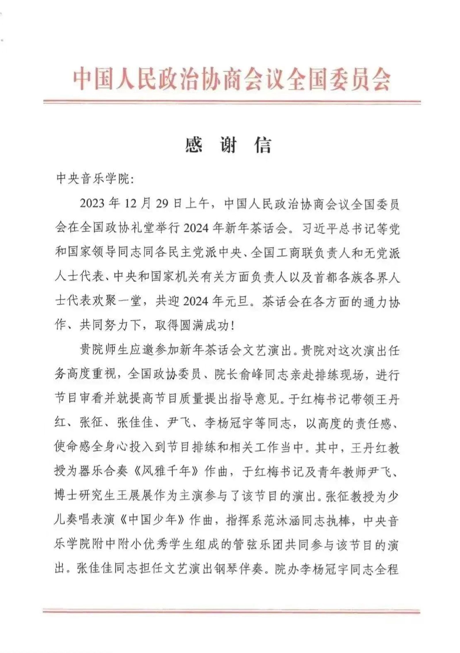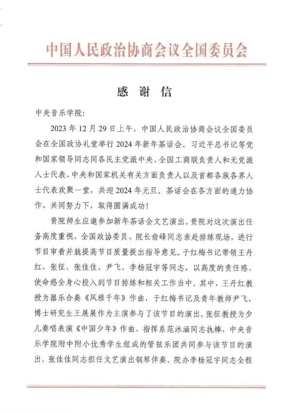 近日,KY开元收到全国政协文化文史和学习委员会办公室发来的感谢信,对学校及参与新年茶话会文艺演出的全体演职人员表示衷心感谢。