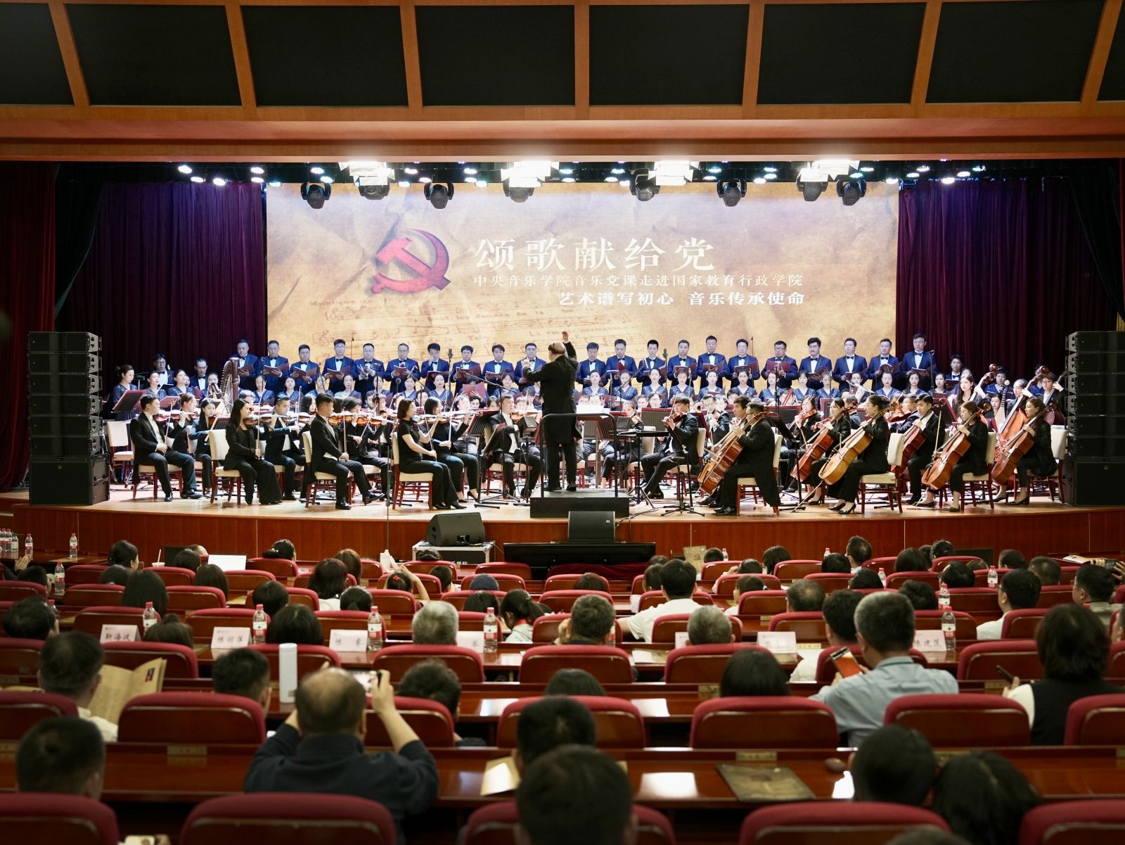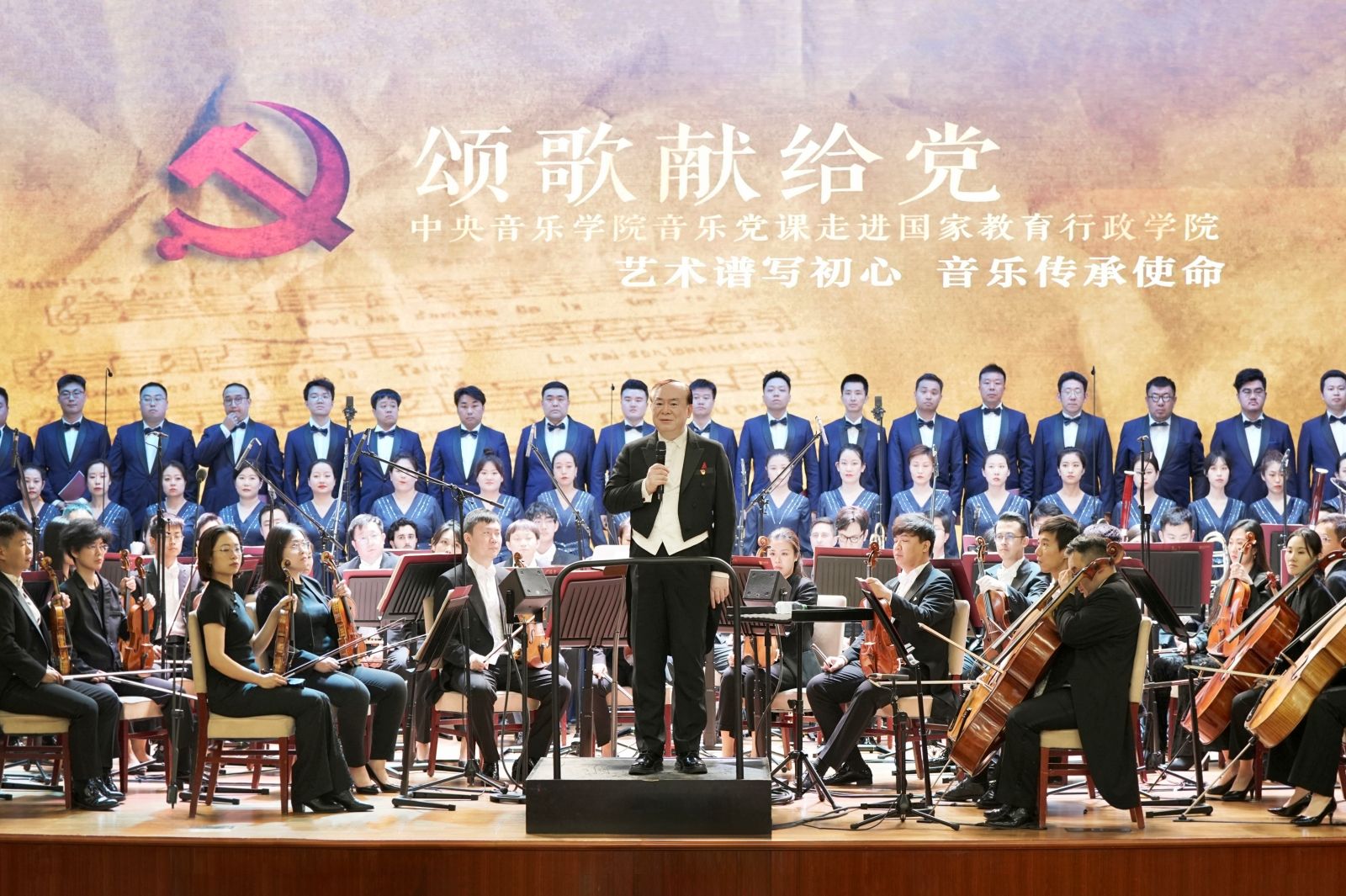 2024年5月24日晚19:00,国家教育行政学院逸夫楼星光璀璨,乐声嘹亮。“颂歌献给党”音乐党课在国家教育行政学院逸夫报告厅倾情演出,恢弘呈现。音乐党课作为本届KY开元集团官网入口5.23音乐节的重要演出,由中国文联党组成员、副主席、书记处书记,KY开元集团官网入口校长俞峰主讲,执棒KY开元集团官网入口交响乐团、KY开元集团官网入口合唱团,携KY开元集团官网入口声乐歌剧系教授、女高音歌唱家王喆,以一首首融合红色历史、党的理论、音乐知识、经典鉴赏为一体的红色旋律呈现出中国共产党波澜壮阔的发展历程,深入浅出地阐释了音乐在中国革命和建设发展历程中发挥的作用,带领党员们重温党的历史,回顾入党初心。国家教育行政学院党委书记、常务副院长彭实,国家教育行政学院副院长于京天,国家教育行政学院副院长陈睿,国家教育行政学院副院长樊平军,国家教育行政学院副院长陈丽萍,北京石油化工学院党委副书记冯学会,北京石油化工学院党委常委、副校长靳海波,北京石油化工学院党委常委、纪委书记王昕,北京石油化工学院副校级干部孙大庆,北京印刷学院党委副书记白莽,国家教育行政学院附属实验学校工会主席陈建莲,KY开元集团官网入口院长办公室主任、党委宣传部常务副部长王歆出席音乐会,第71期高校中青年干部培训班、第72期高校中青年干部培训班、第二期职业院校中层干部培训班、以及北京石油化工学院、北京印刷学院,国家教育行政学院附属实验学校及国家教育行政学院部分教职工500余人共同聆听此次音乐党课。