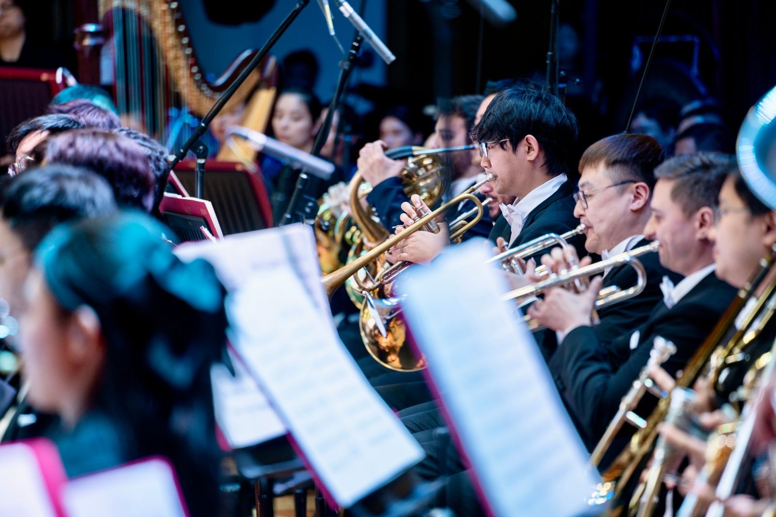 用音乐上党课,用艺术讲党史。一首激扬的音乐,一段峥嵘的岁月。从光辉的革命到如今的成就,再到未来的展望。从救亡图存到浴火重生,再到伟大时代,音乐再现了共产党人的革命精神、描摹出共产党人的初心与使命。1945年,诞生了我国第一部新歌剧《白毛女》,用歌剧的艺术形式表现我们民族的革命现实。《白毛女》选曲《北风吹》呈现出旧社会把人变成鬼,新社会把鬼变成人的现实写照。国歌是一个国家的象征,它反映和表达了民族的心声、国家的意志和精神,《义勇军进行曲》激起了中国人民的抗日热情,表达了中华民族共同的心声,时至今日,也一直激励着我们前进,前进,前进进!《人民英雄纪念碑》是一首史诗性的交响诗,大提琴与低音提琴缓慢的引子表现出人们瞻仰英雄纪念碑时的哀悼与沉思,在俞峰院长的指挥下,乐团用动情的演奏极力塑造了英勇果敢的英雄战斗形象,在高潮部分当木管乐器与弦乐器再次奏出主题的引子时,与圆号的一问一答仿佛跨越时空,让我们踏着前辈先烈的血迹,书写新时代的华章。同样,《红旗颂》更是以交响乐的形式,表现出中国人民在红旗的指引下,英勇顽强,奋发向上的革命气概,热情讴歌了伟大祖国蒸蒸日上的繁荣景象。《万泉河水清又清》反映了“军民融合”的主题思想,正如我们心中对革命的坚定信念正如那河水一般清澈,流淌不息。