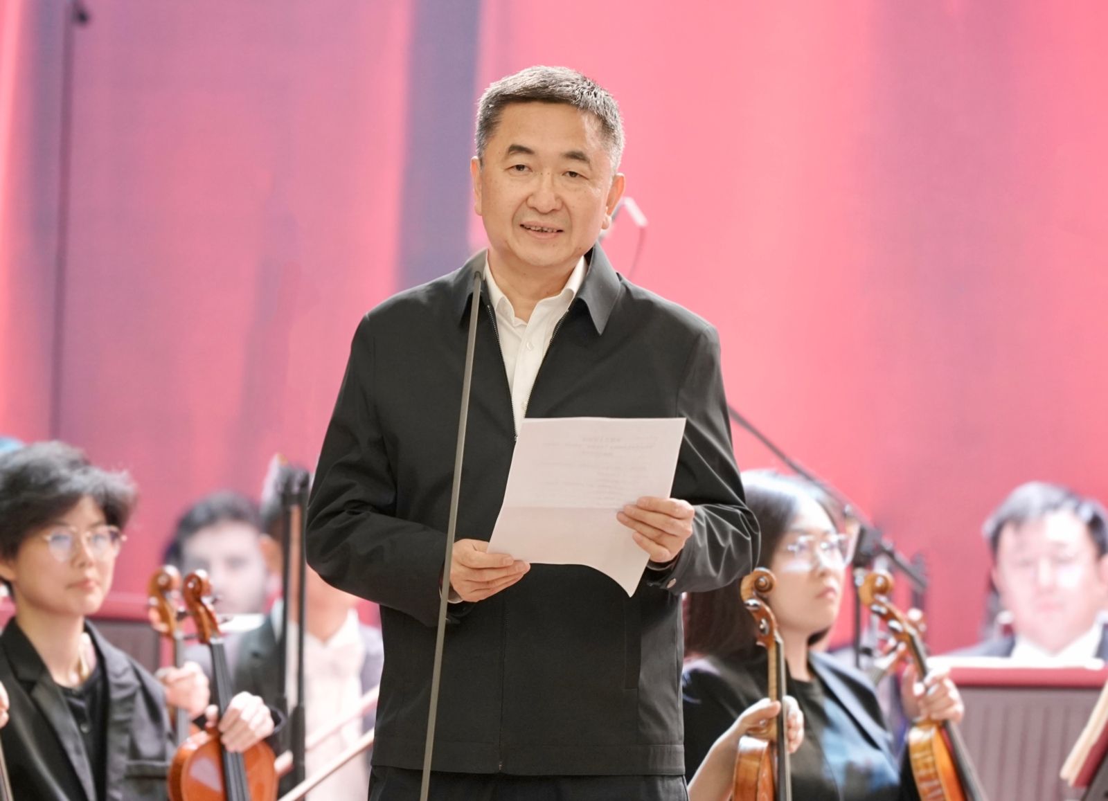 音乐党课开始前,国家教育行政学院党委书记、常务副院长彭实对俞峰院长一行的到来表示热烈欢迎和诚挚感谢。他在致辞中表示:“多年来,俞院长领衔创作的各类主题音乐党课,走进国内高校、干部学院和机关单位,在学习强国全网传播,以音乐党课的匠心独运,创造了新时代用文艺宣传党和理论的成功典范。俞院长亲自策划组织,担任主讲、指挥。全体参演嘉宾不辞辛劳提前来到学院彩排,令人感动和敬佩。让我们聆听红色旋律,穿越辉煌历史,感悟信仰力量,进一步传承红色基因,赓续精神血脉,为加快建设教育强国,以中国式现代化全面推进强国建设,民族复兴伟业作出新的更大的贡献”。
