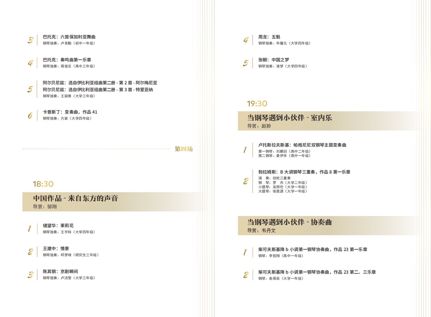 这是一场钢琴作品文献中的经典大集合,也是一场代表了央音学生最高水准的一次听觉盛宴。引经据典,看见声音,大音希声,乐于无形。