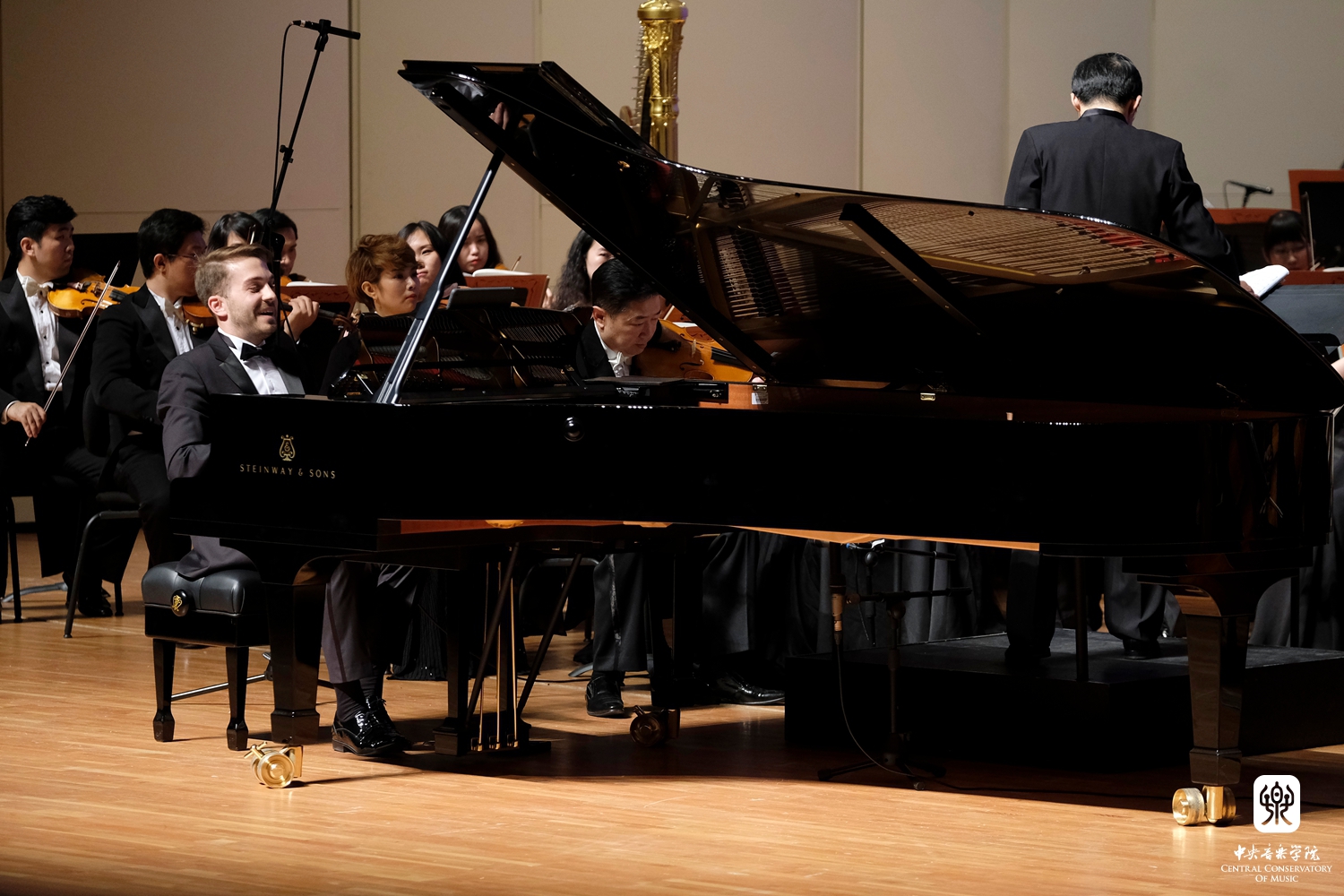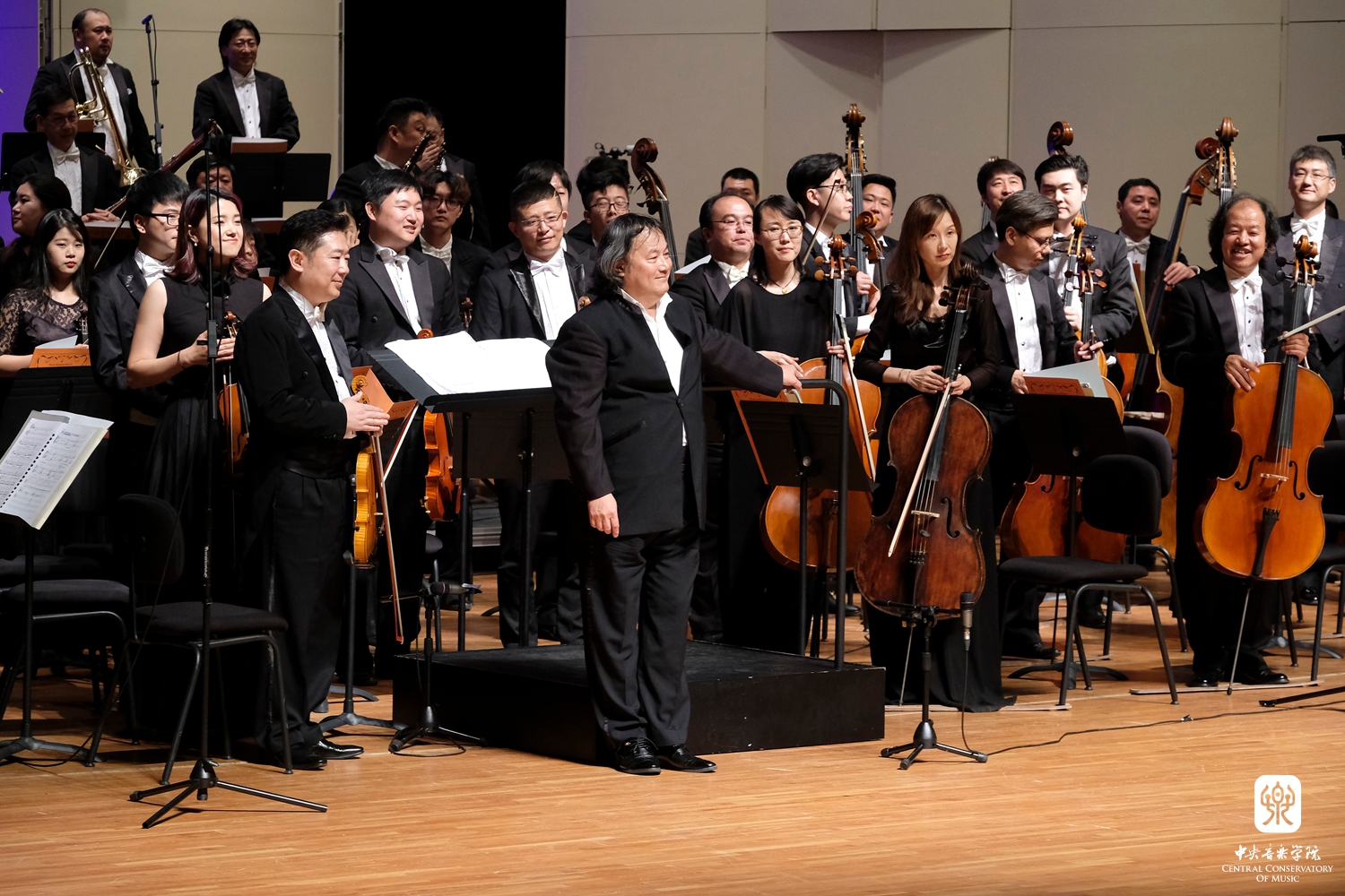 指挥陈正哲与乐团特邀首席梁大南谢幕 摄影:郭名洋 |
