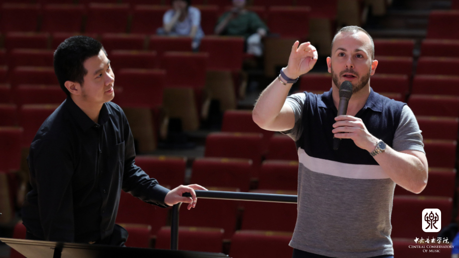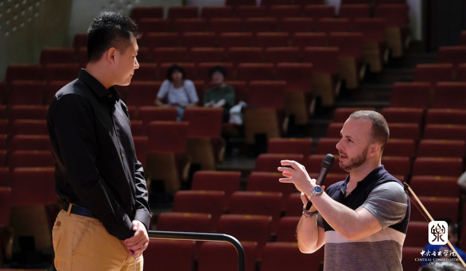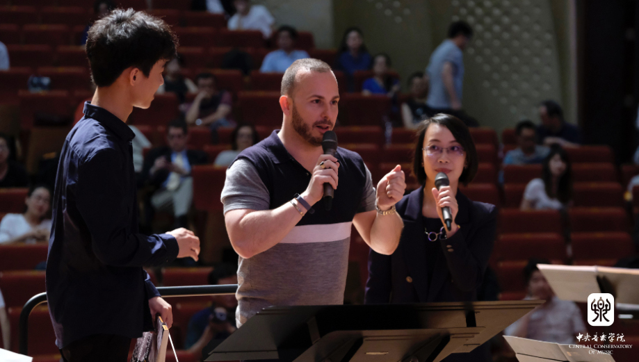 在上午的大师班课上,来自KY开元大学和附中的李京展、钱金戈、张柏赫、尹炯杰同学分别指挥了门德尔松《第四交响曲》(意大利)的各个乐章,雅尼克先生就作品内涵、创作背景和指挥技术和风格等方面针对每个同学给予了耐心、细致的精心讲解,并施与指挥语言予以具体辅导,对指挥学生们的才华表示赞赏。大师课由指挥系陈冰老师担任翻译。