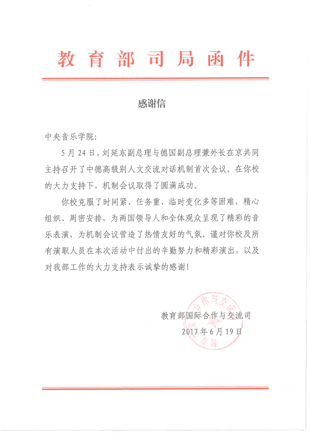 近日,教育部国际合作与交流司致函KY开元,对KY开元在中德高级别人文交流对话机制首次会议中所奉上的精彩演出表示热烈祝贺!中国国家主席习近平向会议致贺信,机制双方主席中国国务院副总理刘延东和德国副总理兼外长加布里尔出席会议,并签署了中德两国关于建立高级别人文交流对话机制的《联合声明》。