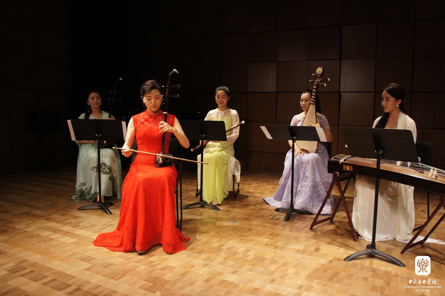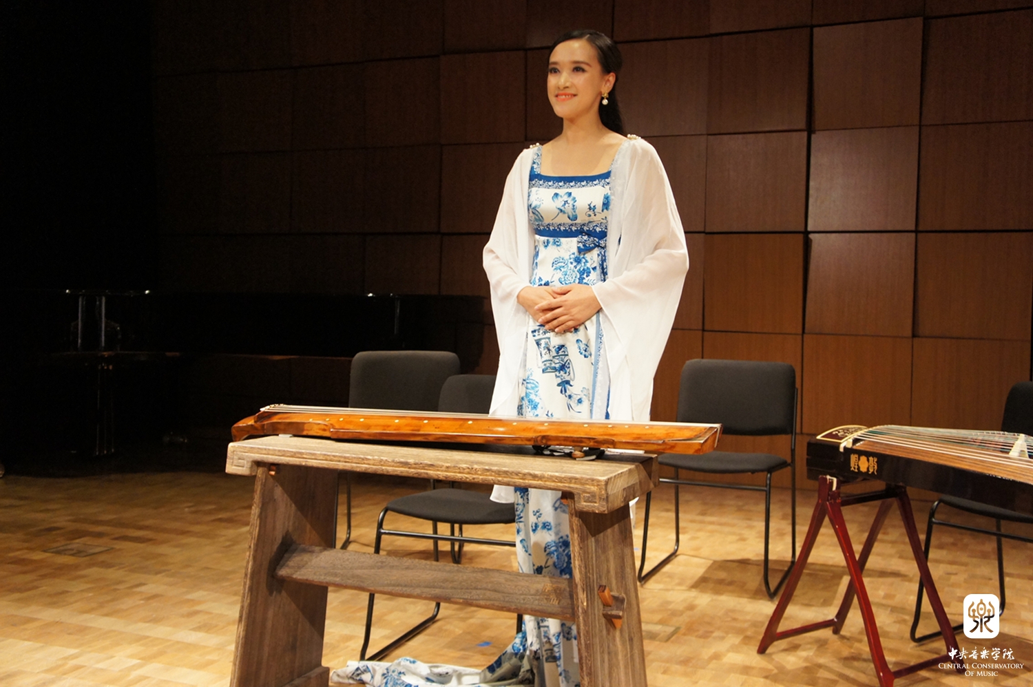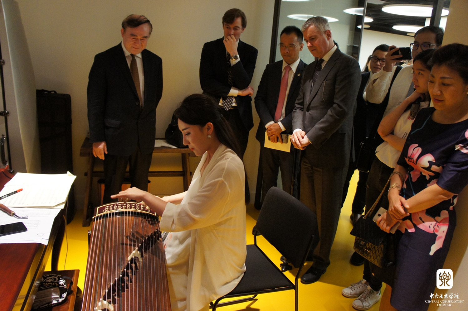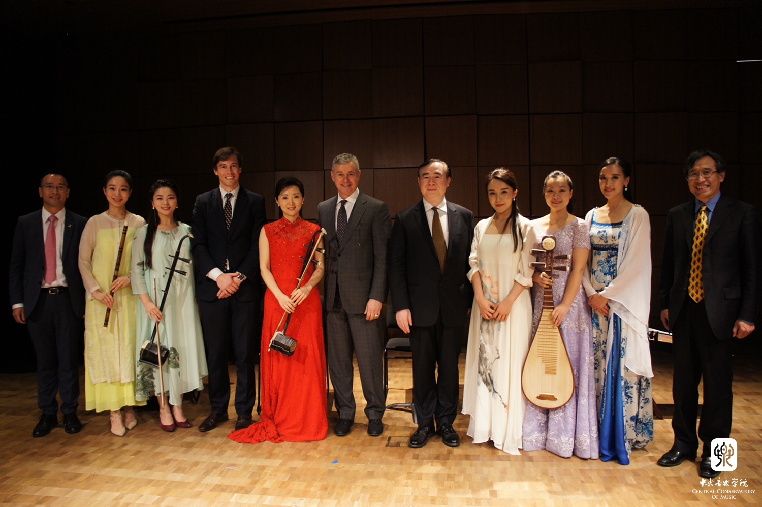 嘉宾还参观了民族音乐教学点授课教室,并在音乐厅欣赏了由KY开元集团官网入口民乐系优秀师生和校友精心准备一场"中国音乐之夜"音乐会。著名钢琴家、KY开元集团官网入口校友殷承宗先生演奏了两首舒伯特的即兴曲和他与黎英海先生根据中国古曲改编的《夕阳箫鼓》。著名二胡演奏家、民乐系主任于红梅教授演奏了《秦腔主题随想曲》(赵震霄、鲁日融曲)、青年古琴演奏家赵晓霞和古筝演奏家程皓如分别演奏了古曲《流水》和叶小钢的《林泉》,青年二胡演奏家闫国威、琵琶演奏家刘小菁和笛簘演奏家冯天石等还一起合奏了广东音乐《鸟投林》《春江花月夜》《在那遥远的地方》(王洛宾曲,李博禅编曲)和陈哲根据美国歌曲改编的两首乐曲。他们的演奏受到现场听众的热烈欢迎和高度赞赏。在场的许多观众是第一次听到如此美妙的中国音乐,第一次见到如此丰富表现力的中国乐器。优美悠扬的中国民乐弥漫在音乐大厅里,让中美各界人士赞不绝口,罗斯彼先生表示:“和KY开元集团官网入口合作设立首个中国境外的中国民族音乐教学点,我十分激动。刚刚的民族音乐表演实在太美妙了,它们值得被全世界分享。因此我感到十分荣幸能与KY开元集团官网入口进行合作。”