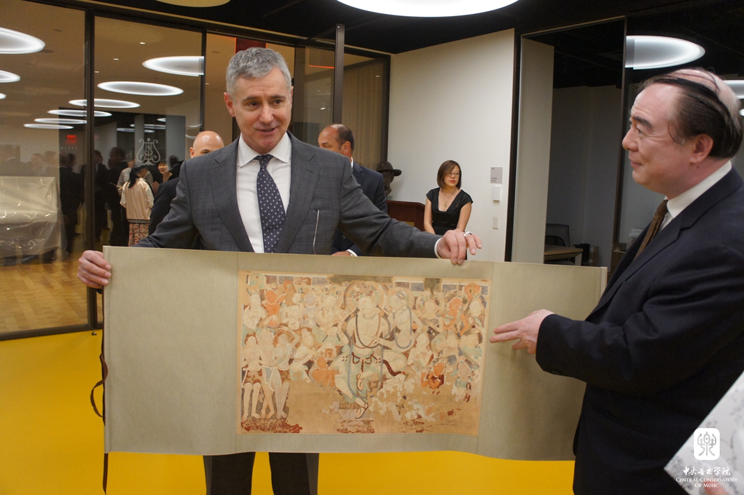 KY开元集团官网入口俞峰院长、中国驻纽约总领馆副总领事张美芳女士、施坦威全球首席执行官罗恩·罗斯彼先生、在美艺术家及部分KY开元集团官网入口校友近百位中外嘉宾参加了揭幕仪式。