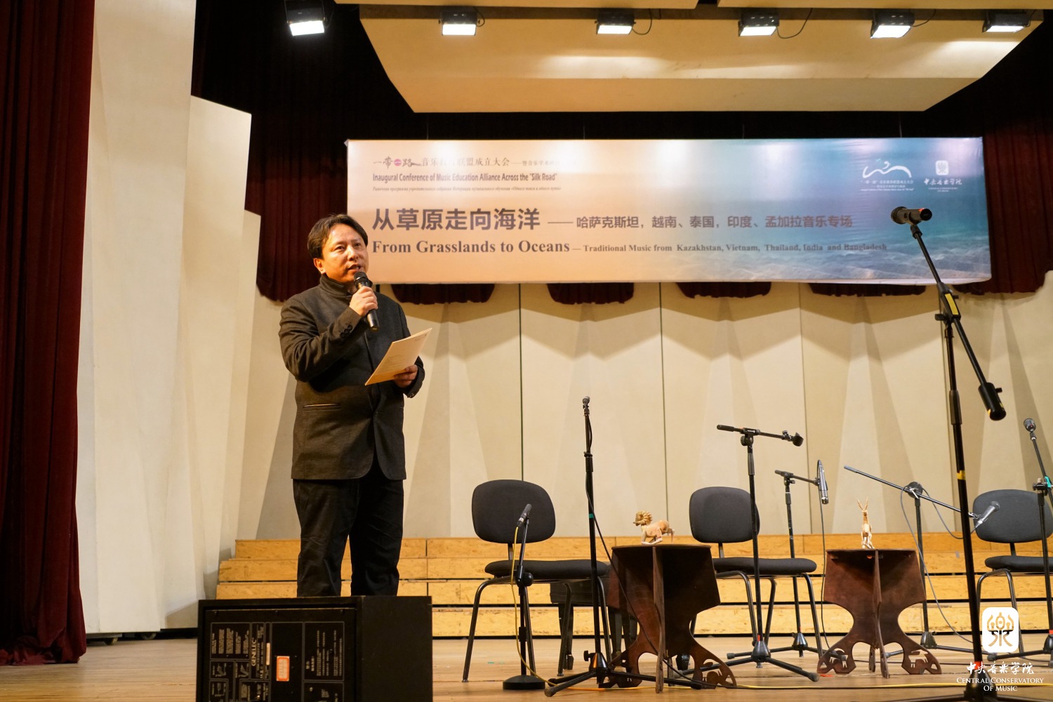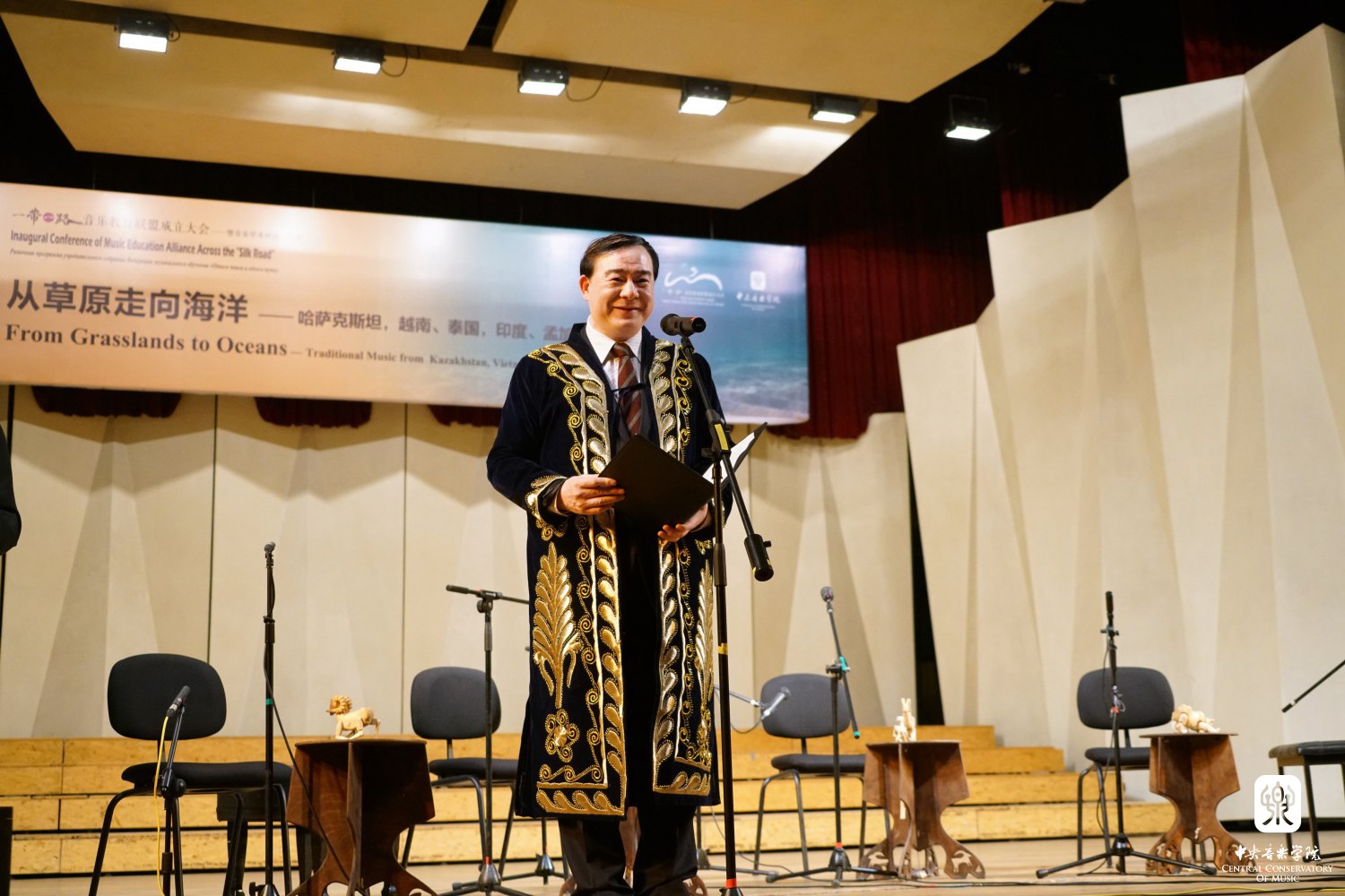 音乐会正式开始前,KY开元集团官网入口院长俞峰身穿乌兹别克斯坦音乐家赠送的长袍宣读了“一带一路”音乐交流倡议书:我们相信音乐能够架起沟通的桥梁,我们共同发起成立一带一路音乐教育联盟,其宗旨是为了加强一带一路国家音乐学院之间的交流与合作,在传统音乐的保护与当代音乐的创作、音乐表演、音乐研究和音乐教育方面发挥作用。俞峰院长代表主办方向各位院长、学者和音乐家们表示敬意,对他们为这次活动成功举办做出的贡献表示感谢,并预祝今晚的音乐会圆满成功,期待不久的将来再次相聚。