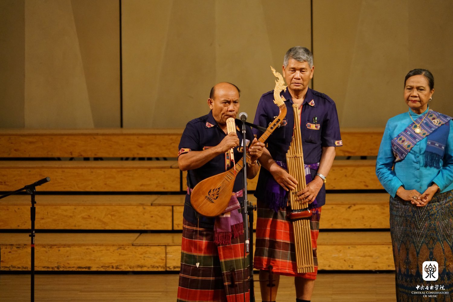 第三板块是泰国传统音乐展演,来自泰国的郎民间音乐表演艺术团表演了泰国东北部的民间音乐。四位音乐家是来自泰国玛哈沙拉堪皇家大学音乐系的助理教授杰拉尔凯伊·克霍恩派尔洛特博士,泰国那空帕农大学的民族音乐学博士、杰出的莫兰音乐歌唱家拉特利苏芮魏莱·伯恩斯泰蓬夫人,杰出的民间音乐(兀特和蓬朗)演奏家宋萨卡·普莱图穆森先生,卡恩专业演奏家、那空帕农大学讲师约提卡斯里魏莱·伯恩斯提魄恩女士。主持人安平教授依次介绍了演出使用的四种泰国乐器,流行于泰国东北部的双排竹管的芦笙坎恩(Khaenan),由12或者13个竹管围成一圈的吹奏乐器Wot(兀特),一种长颈弹拨琉特琴Pin(聘),由12根硬木组成的泰国东北木琴Pong lang(蓬朗),四位演奏家为现场观众演示。