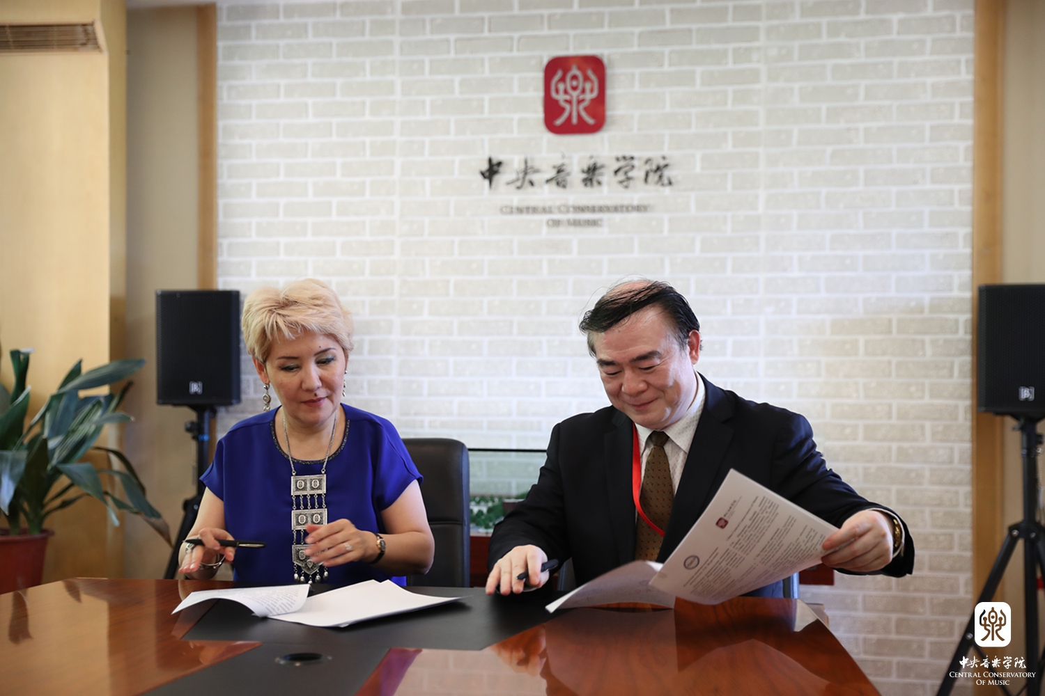 在哈萨克斯坦国立艺术学院代表团参加音乐教育联盟成立大会期间,两校举行了校际交流合作协议书的正式签署仪式,俞峰院长和努西普扎诺娃院校长分别代表各自的学校在协议书上签字。