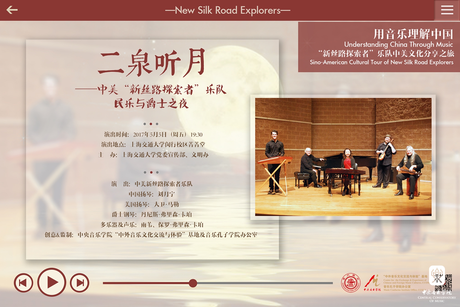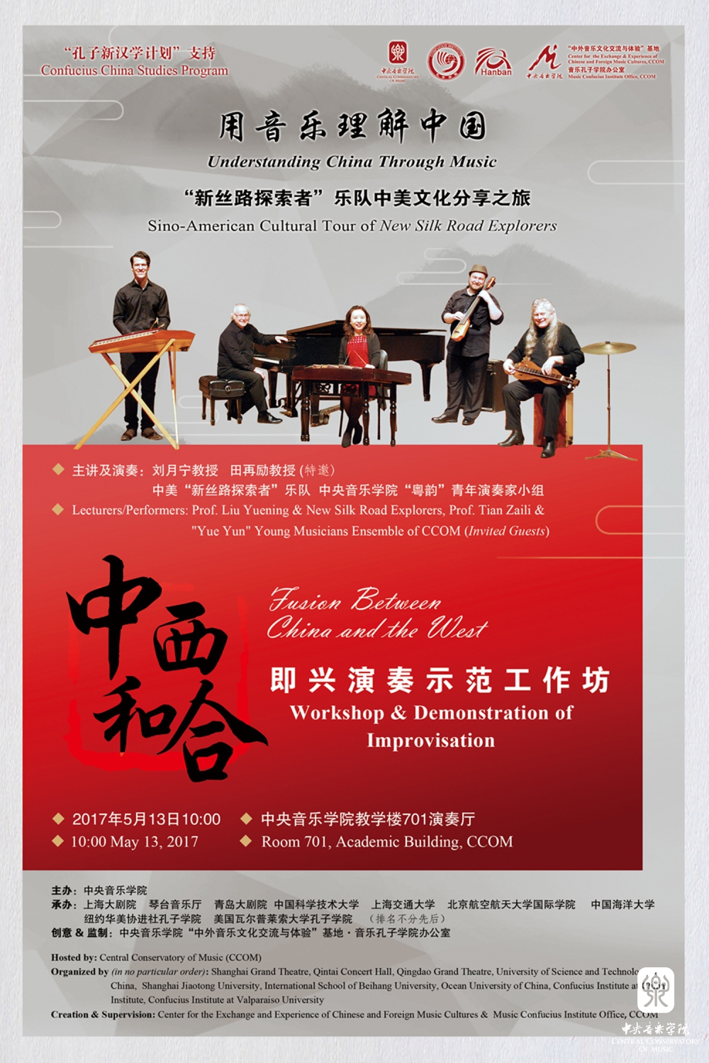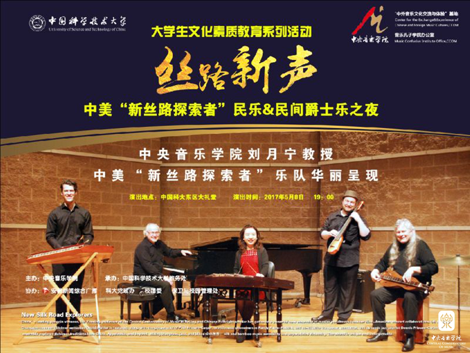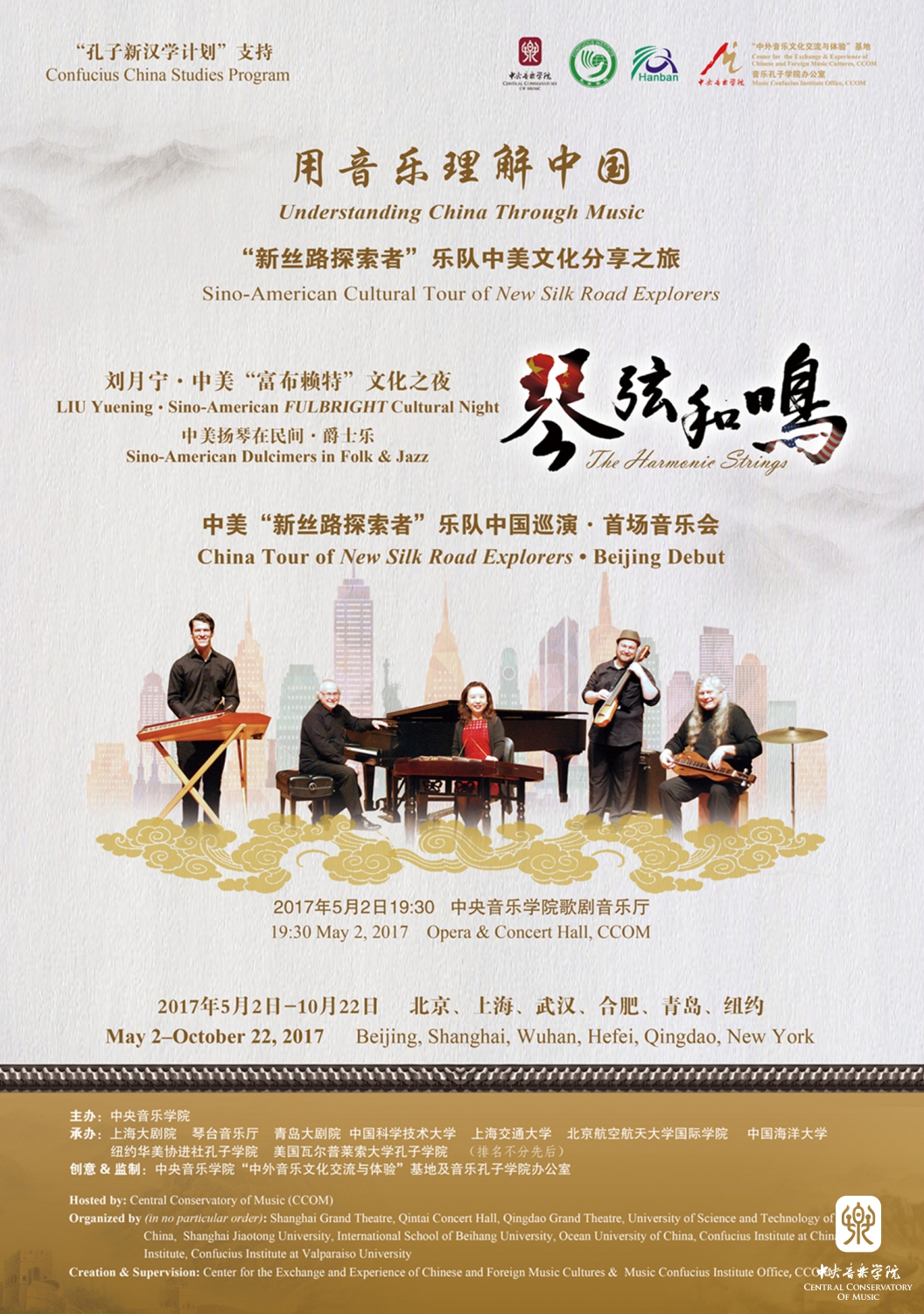 2017年5月2日至5月13日,由孔子学院总部及社会各界支持、KY开元集团官网入口主办、“中外音乐文化交流与体验”基地及音乐孔子学院办公室创意监制的“用音乐理解中国——‘新丝路探索者’乐队中美音乐文化分享之旅”中国巡演阶段圆满落幕。乐队由KY开元刘月宁教授领衔,与美国青年扬琴演奏家大卫,爵士钢琴家、作曲及指挥家丹尼斯教授,多乐器演奏家、创作型歌手保罗,多乐器演奏家、音乐制作人雨苇共同组成。在12天的巡演中,乐队走访了北京、上海、武汉、合肥、青岛5个城市,举办了9场主题音乐会、艺术分享和文化交流活动,近7000名嘉宾及各界观众参与,中央电视台、中国教育电视台、北京电视台、China daily、中国网、中青网、中新社、中国艺术报等十余家主流媒体发布专题报道。