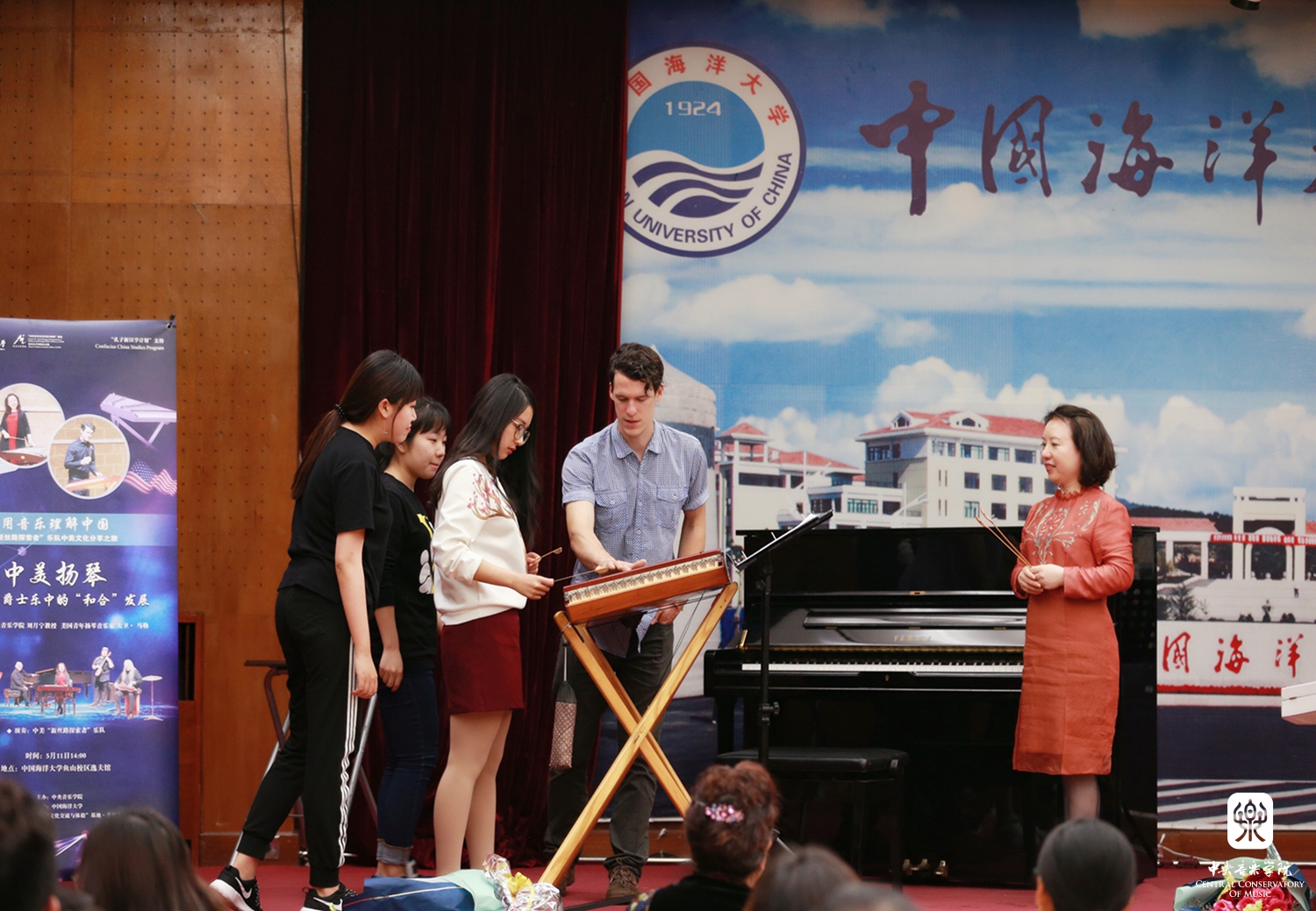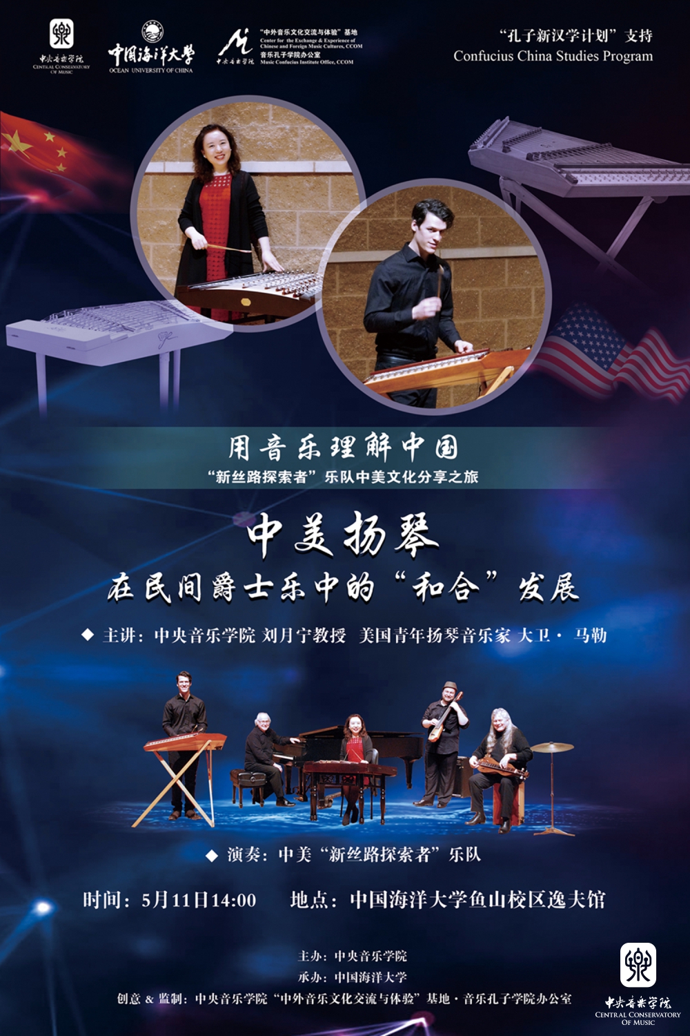 5月8日,“新丝路探索者”与中国科学技术大学学生合唱团,合作演绎《思念》,在中西乐器的和鸣下,共同唱响不同文化背景对中国歌曲的新理解。5月11日,刘月宁教授为中国海洋大学艺术系师生宏观讲解了当代中国扬琴发展脉络,通过大卫现场演示,介绍了美国扬琴的发展历史与技巧变化。5月12日,北京航空航天大学学生民乐团用《欢乐的夜晚》《敦煌新语》,向美国音乐家们展示了中国综合类大学的艺术教育水平。5月13日,在KY开元举办的《中西合和——即兴演奏示范工作坊》特邀KY开元田再励教授及其指导的“粤韵”青年演奏家小组,在对比、展示和相互交流中,探讨中西音乐即兴的“异同”问题,回归音乐本体。