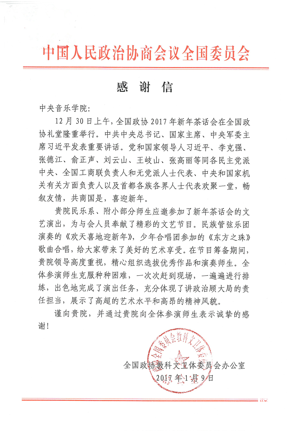 应全国政协的邀请,KY开元民乐系、附中师生参加了2017年全国政协茶话会文艺演出,为党和国家领导人习近平、李克强、张德江、俞正声、刘云山、王岐山、张高丽等参加政协茶话会的各级领导和各界人士奉献了精彩的表演。KY开元民乐系师生演奏的民族管弦乐合奏《欢天喜地迎新年》,KY开元少年合唱团演唱、陈冰老师指挥、成龙委员领唱的歌曲《东方之珠》受到与会各界人士的广泛好评。全国政协、文化部的有关领导对KY开元师生高超的艺术水平和优良的作风表示高度赞扬。
