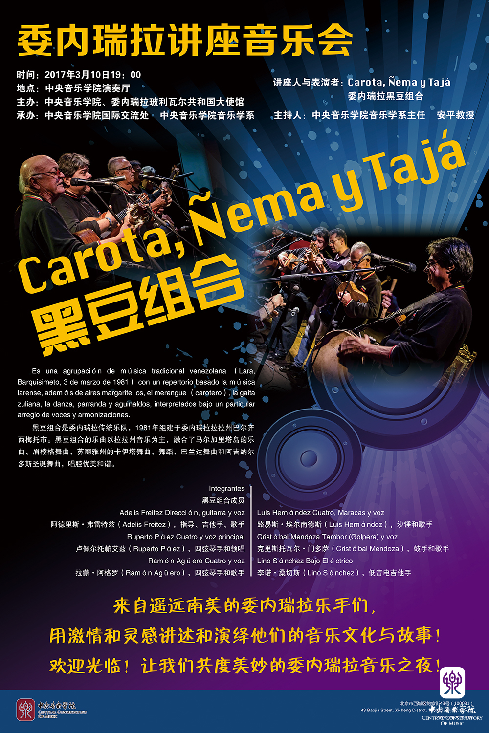 2017年3月10日晚7时,KY开元集团官网入口的琴房楼演奏厅举办了一场来自委内瑞拉的别开生面的讲座音乐会。这场盛会的举办一是为纪念委内瑞拉玻利瓦尔共和国最高统帅乌戈·查韦斯逝世4周年,二是为促进中国、委内瑞拉两国友谊的良好发展。当晚音乐会的主角是委内瑞拉国宝级的乐队--"Carota, ?ema y Tajá(黑豆组合)"。黑豆组合是委内瑞拉传统乐队,1981年组建于委内瑞拉拉拉州巴尔齐西梅托市,音乐家们现在已是年过半百的老爷子,但嗓音依旧高亢嘹亮,音乐极富感染力。该乐队由吉他、四弦琴、沙锤、鼓、低音电吉他组成。通过乐队成员的演奏和演唱,向观众们展示了多姿多彩的、特色鲜明的、充满异国情调的委内瑞拉传统音乐。黑豆组合的乐曲以拉拉州音乐为主,融合了马尔加里塔岛的乐曲、梅林盖舞曲、苏丽雅州的卡伊塔舞曲、舞蹈、巴兰达舞曲和阿吉纳尔多斯圣诞舞曲,唱腔优美和谐。黑豆组合在委内瑞拉是极具影响力的乐队组合,曾赴前苏联、朝鲜、瑞士、法国、美国、巴西、古巴和阿根廷演出。黑豆组合出版了17部唱片作品,200多首歌。正如黑豆是委内瑞拉人非常喜欢的主食,黑豆乐队的音乐也是委内瑞拉人的精神食粮,深受大家的欢迎。