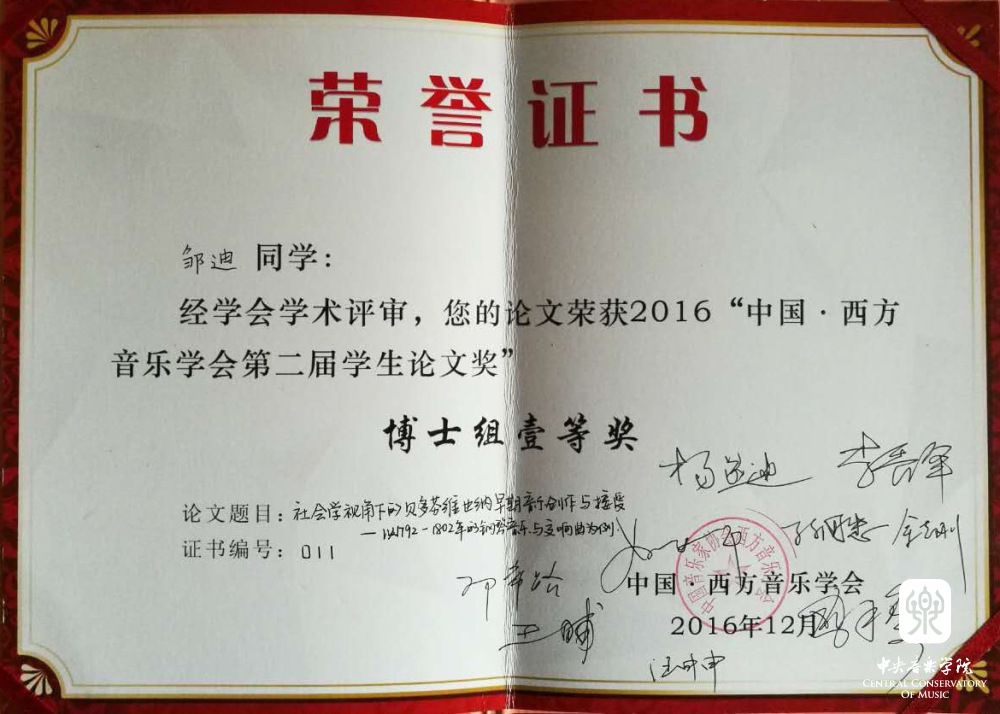 博士一年级学生邹迪的《社会学视角下的贝多芬维也纳早期音乐创作与接受——以1792-1802年的钢琴音乐与交响曲为例》获博士组一等奖,指导教师:周耀群教授。