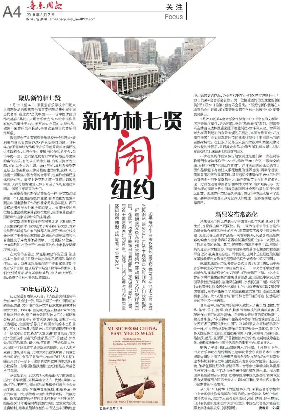 1月19日至26日,茱莉亚音乐学校专门用来上演新作品的聚焦音乐节首度把焦点集中在中国当代音乐,在此次“当代中国——一场中国作曲创作的盛典”其间以6场音乐会力推33位中国作曲家创作的诞生于1940年至2017年间的35部作品,梳理中国音乐创作脉络,全景式展现当代音乐创作风貌。
