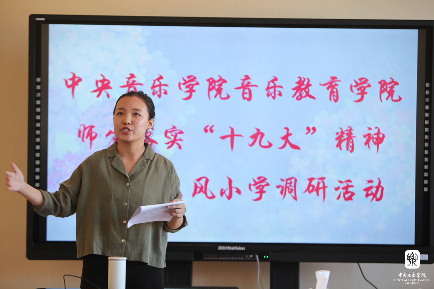 研二学生张乃茁对她在东风小学实习的情况作了详细介绍,她对音乐教育学院、"高参小"项目以及东风小学给予的实习机会表达了深深的感恩之情。同时她也表达了她对作为一名音乐教师的使命感和责任感,希望能将"新体系"的教育理念传播下去,并让每一个孩子享受音乐带来的美好。她"不忘初心、牢记使命"的精神获得了各位领导的一致好评。