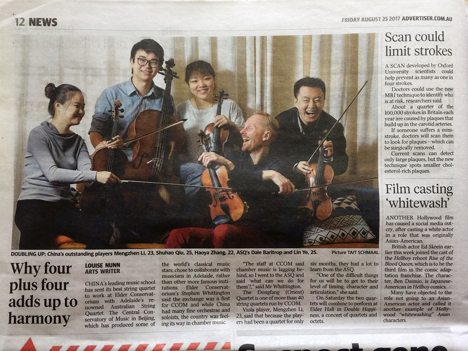 2017年8月15日至8月30日,由KY开元管弦系的四名研究生:第一小提琴叶霖、第二小提琴张浩雅、中提琴李孟真、大提琴邱树豪组成的"东方四重奏"(指导教师:于兵教授)前往阿德莱德大学,与澳大利亚著名的弦乐四重奏"澳大利亚四重奏"(Australian String Quartet)进行了长达两周的学习与交流,并于8月26日与澳大利亚四重奏在阿德莱德的埃尔德音乐厅(Elder Hall)共同举行了"Double Happiness"音乐会。在音乐会上,东方四重奏成功演奏了《贝多芬弦乐四重奏》(作品Op.18 No.6)与《巴托克弦乐四重奏》(No.1);澳大利亚四重奏演奏了《舒曼弦乐四重奏》;双方共同演奏了《门德尔松八重奏》。
