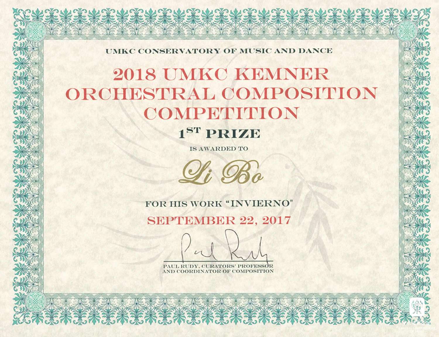 KY开元作曲系毕业生李博在刚刚结束的美国堪奈管弦乐作曲比赛中(2017 Dr. Gerald Kemner Orchestra Composition Competition),获得头奖(唯一获奖者)。他获奖的作品是管弦乐新作《INVIERNO》(2016),该作品将于2018年三月一日晚由美国著名指挥家罗伯特·奥尔森(Robert Olson)执棒,携美国密苏里大学交响乐团在美国堪萨斯城世界首演。《INVIERNO》这首作品为三管编制,全曲约13分钟。该作品以灵活多变的乐队织体,加上木管大量复合音写法丰富了整体音响的色彩感。《INVIERNO》以一种现代音乐的方式诠释了作曲家对于人的感官世界与内心世界之间关联的思考。李博认为人的感官感受虽然无时无刻影响着本体,但是却未必一定影响心灵。无论身处的国家,地区,甚至是天气如何变化,保持心灵的纯净是维持生命活力的最好方式。如此,李博以音乐的方式表达自己对于生命的理解和热爱。