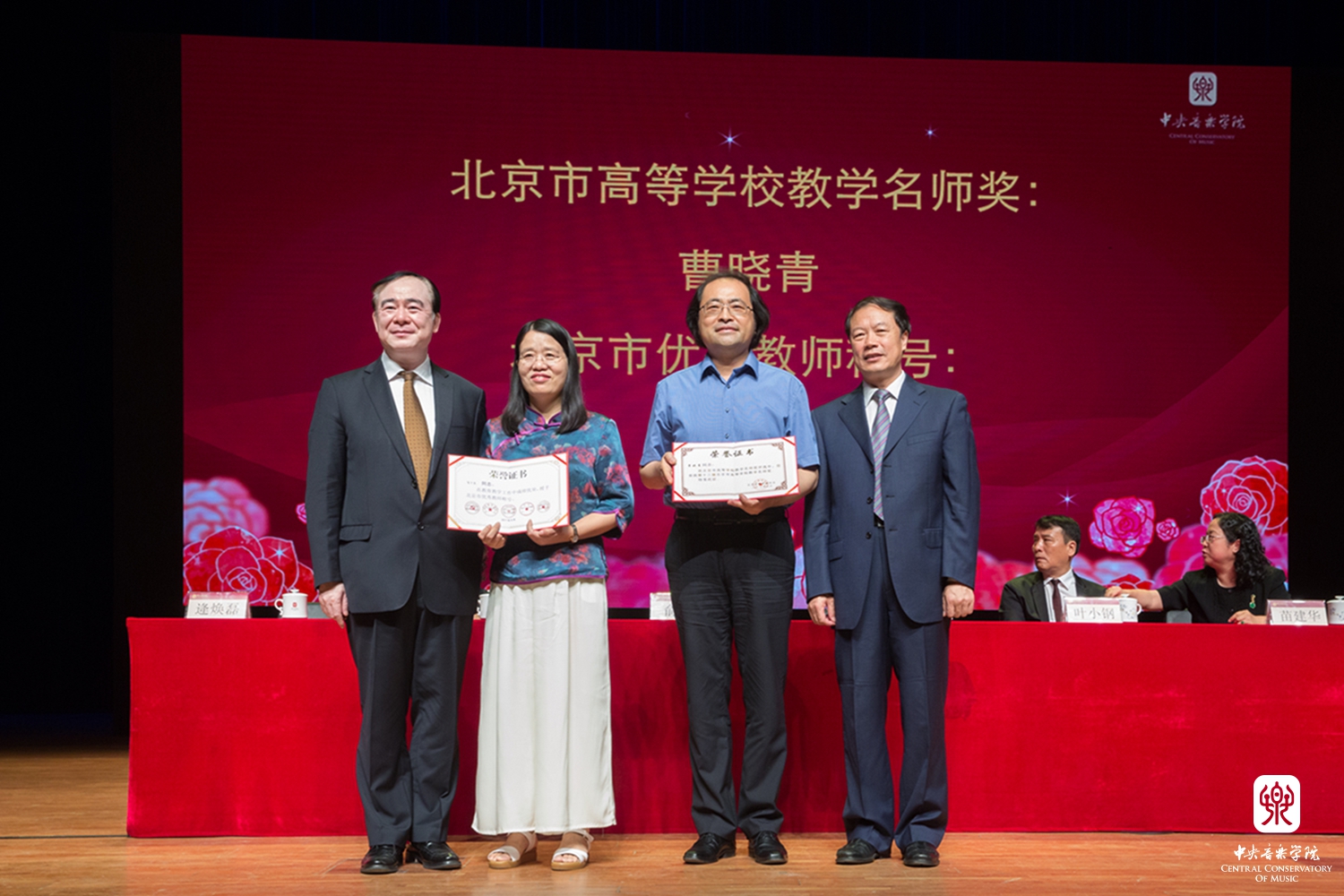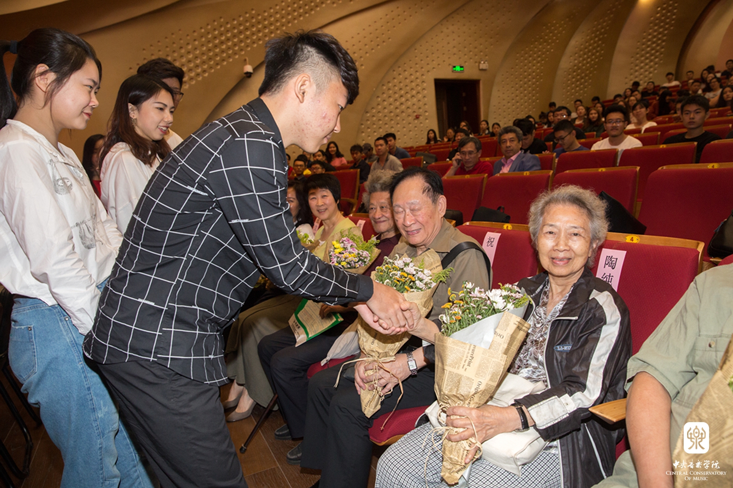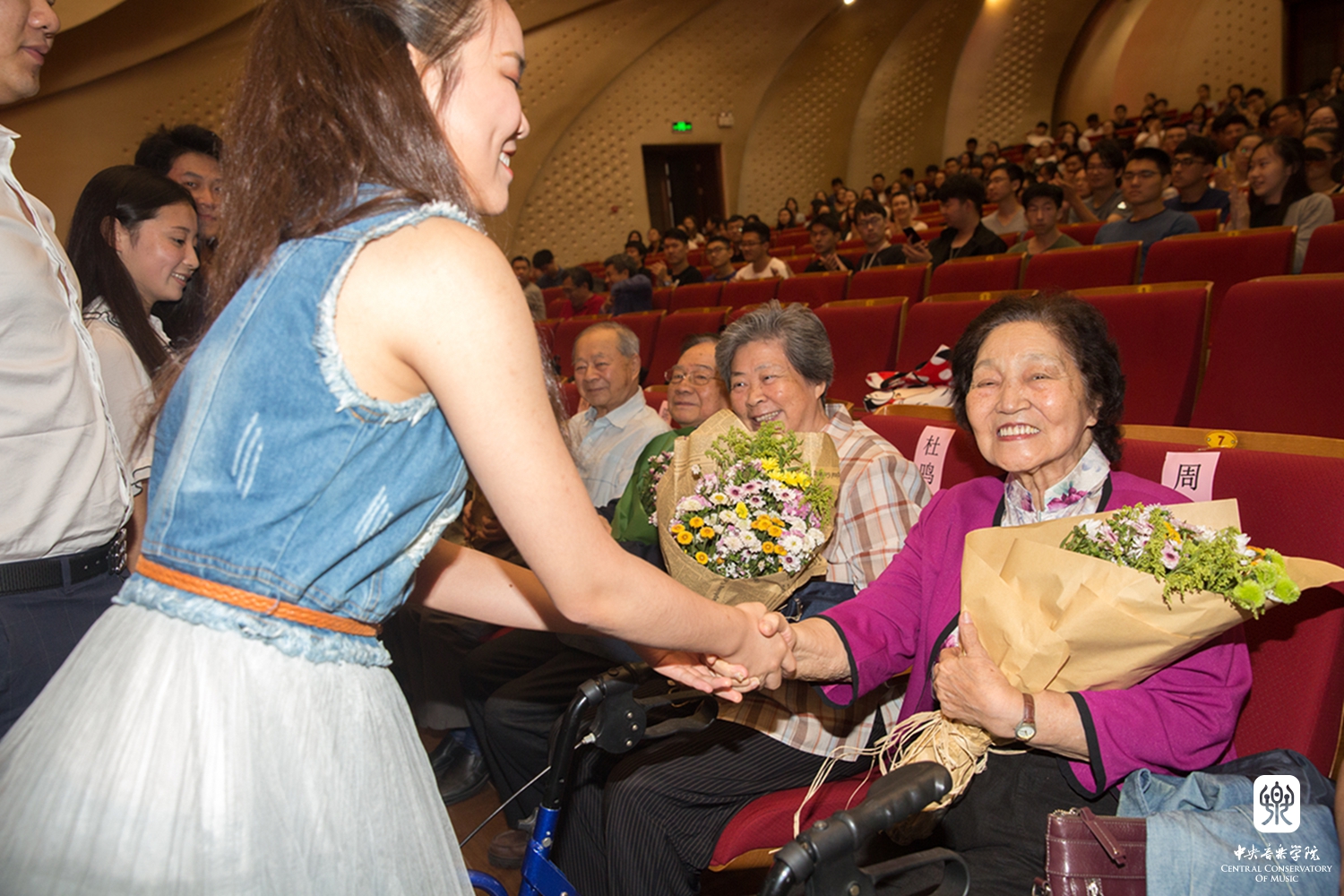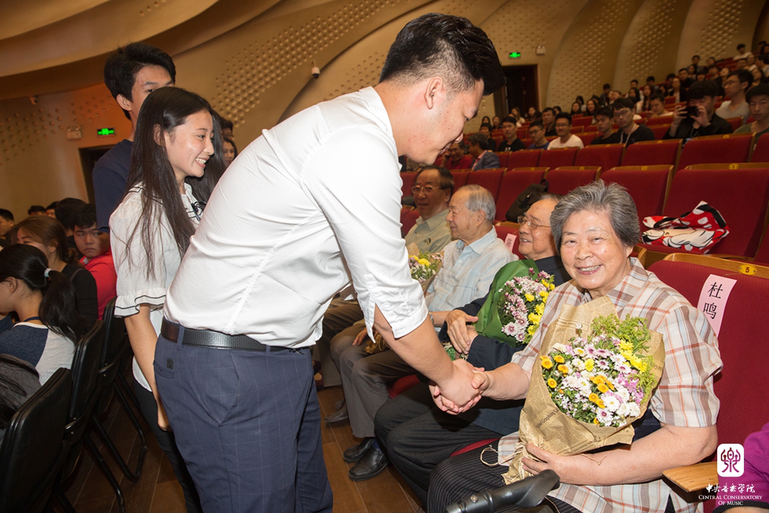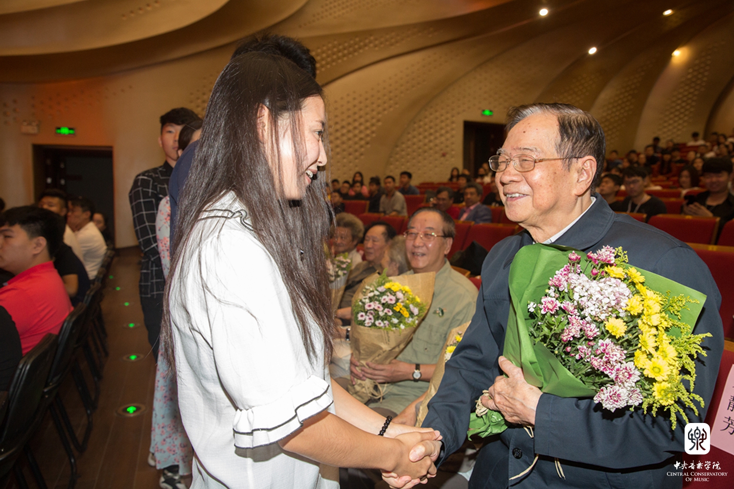 最后,在饱含深情的《感恩的心》的音乐声中,2017级新生代表为周广仁、杜鸣心、杨鸿年、陈自明、陶纯孝、袁静芳、祝盾、刘长福等老教授和各系负责人献上了鲜花和真挚祝福;在校学生代表为2017届新生代表佩戴校徽。参会教师和学生深受感动和鼓舞。年近90岁的钢琴教育家周广仁先生表示:"'立德树人'是KY开元集团官网入口人才培养的优良传统,作为一名在KY开元集团官网入口工作了半个世纪的老教师,要以身作则,切实为中青年教师做好榜样。"音乐学系何宽钊副教授表示:"KY开元集团官网入口有一大批致力于立德树人的优秀教师,他们既有渊博的学识,又有高尚的品格;既在学术上勇立潮头,又在教学上诲人不倦。他们的治学精神和人格高度深深地激励了一代又一代后学。我们将在他们的精神感召下,传递精神财富,潜心教书育人。"