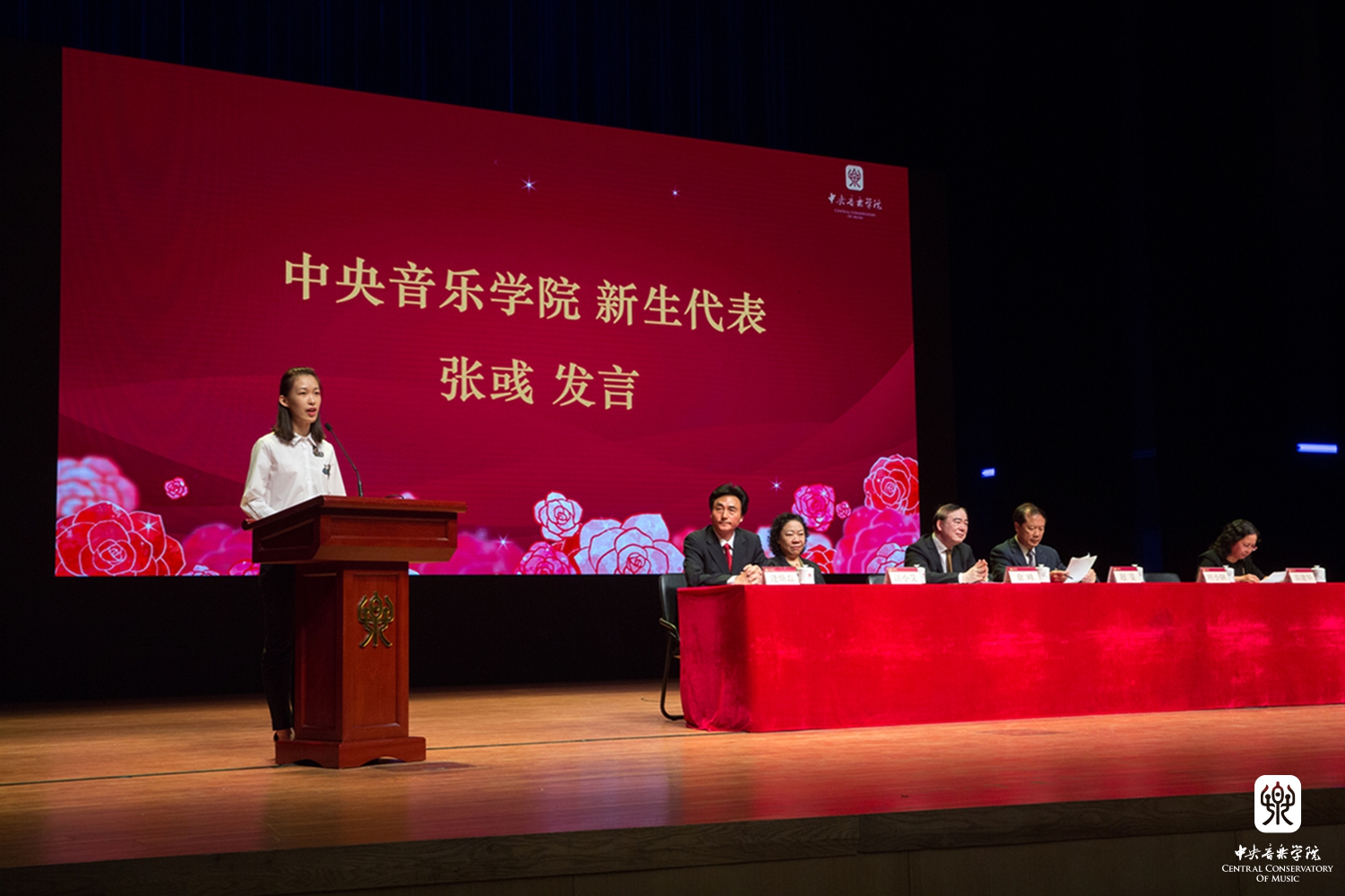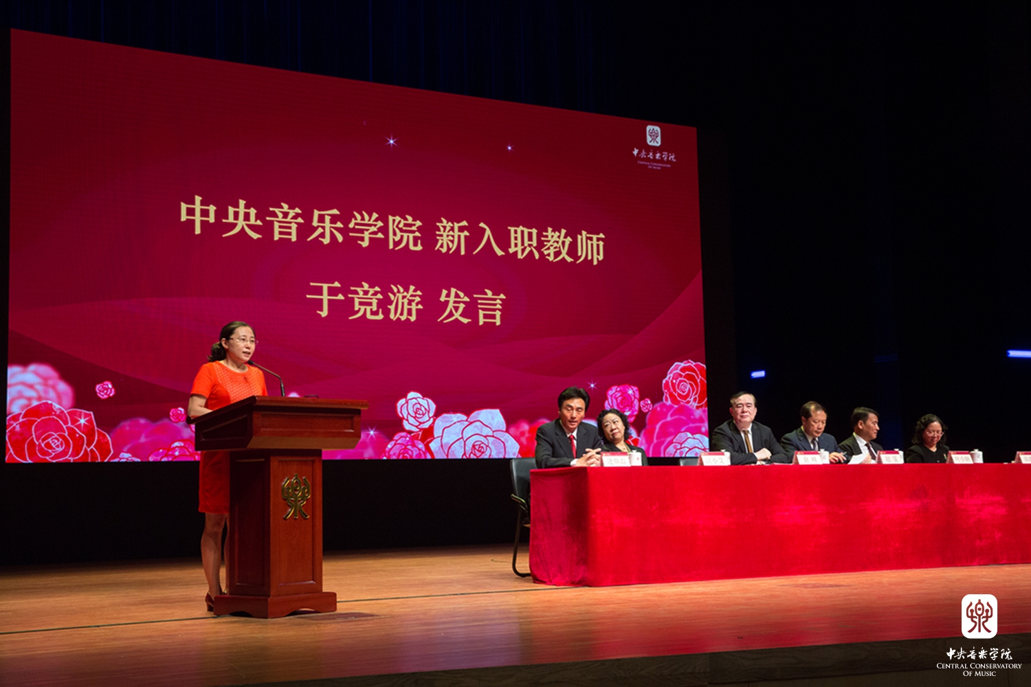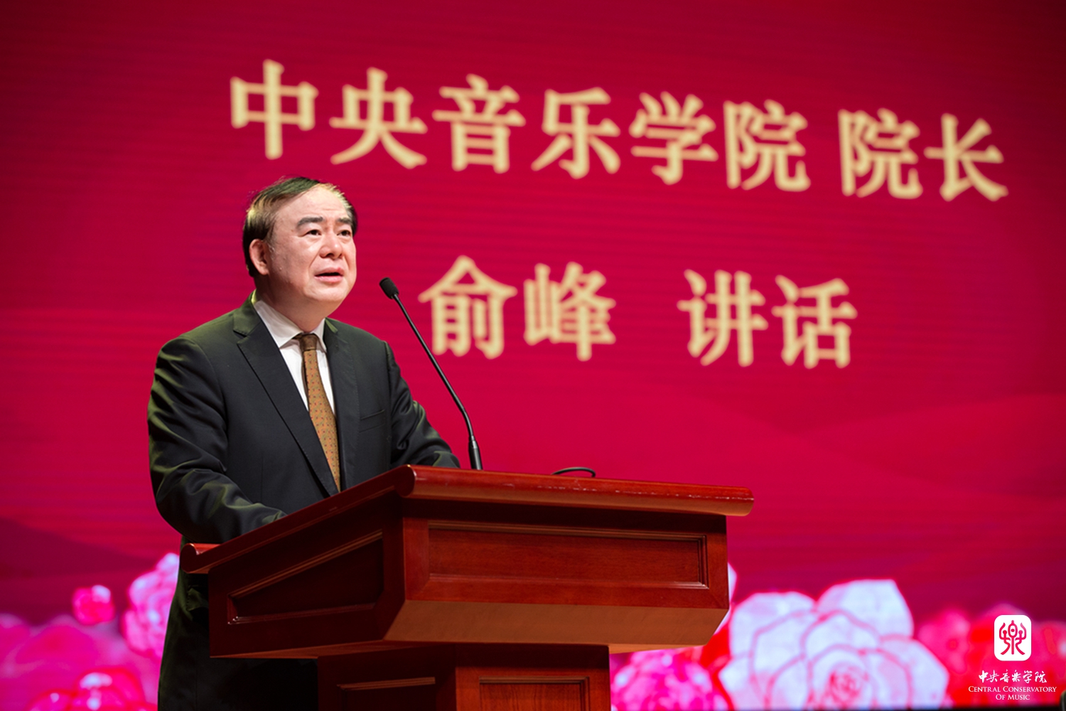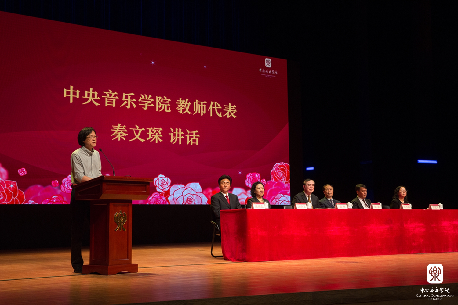 作曲系秦文琛教授作为教师代表发言,他结合在中央音乐音乐学院任教27年的经历,总结出了和学校相关的几个关键词:情怀、国际视野、学术传统等。关于情怀,秦文琛谈到:"每当我在学校看到周广仁老师、郭淑珍老师、段平泰老师、杨鸿年老师、姜夔老师这些老教授,我就在想,我没有和他们学习过一天专业课,但是为什么莫名地会对他们产生一种亲近、温暖,以至崇敬的心情,我觉得这就是教师的人格魅力。在他们的身上不仅能看到对教学的一种责任,更能感受到一种对艺术、对教育的情怀。有了这样的情怀,可以让一个人忘掉自己的年龄,忘掉自己身体的不适,为艺术去努力工作。艺术是人类智慧的最高的成就,值得每一个学习艺术的人为其勤奋一生。"秦文琛教授希望各位同学能将这样一种精神和情怀继承下来。