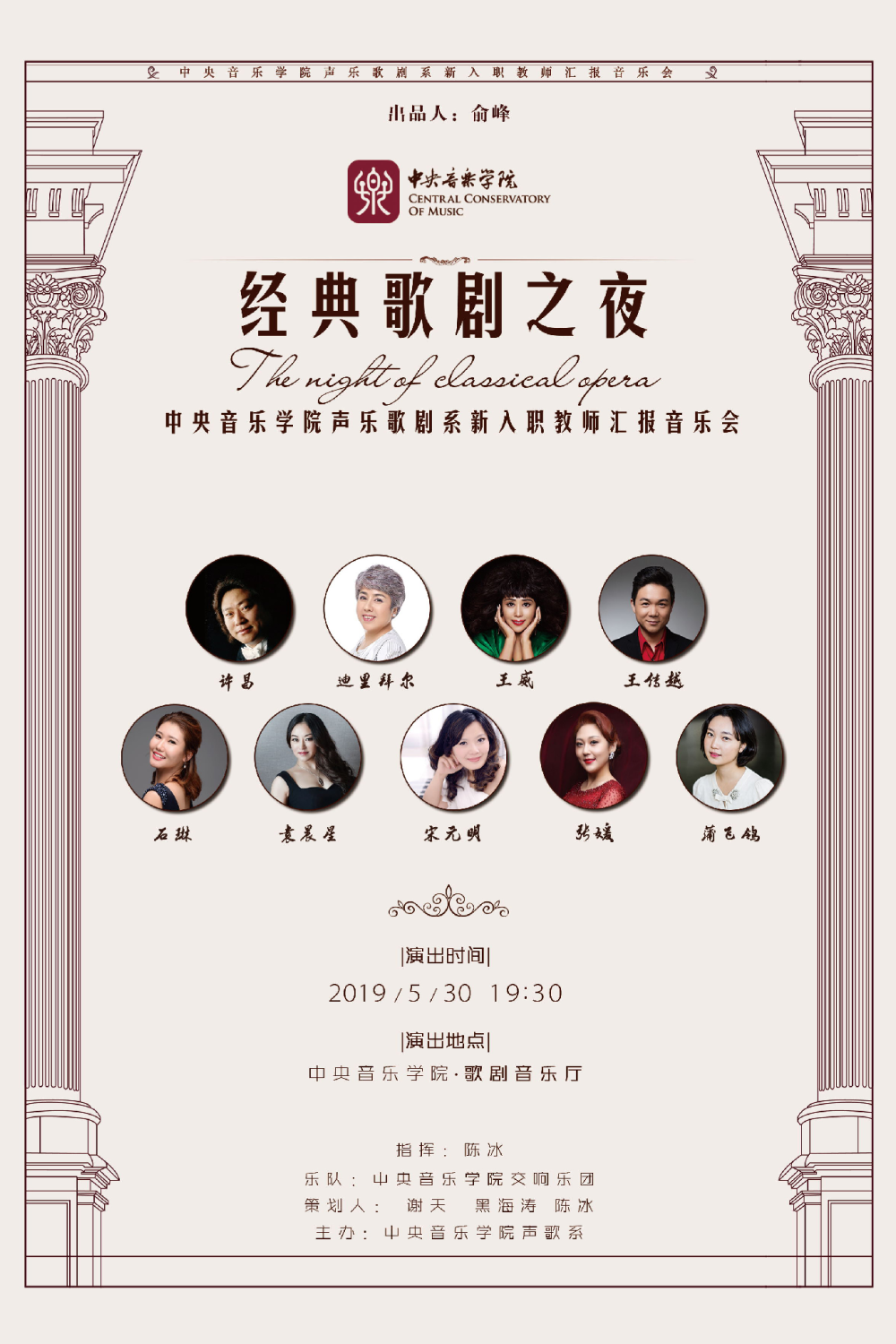 5月30日晚,“经典歌剧之夜”——KY开元集团官网入口声乐歌剧系新入职教师在学校歌剧音乐厅进行了一场汇报音乐会。陈冰副教授携迪里拜尔、王威、许昌、王传越、宋元明、袁晨星、张媛、石琳、蒲飞鸰等9位新入职教师联袂KY开元集团官网入口交响乐团,为观众带来数首世界经典歌剧选段。KY开元集团官网入口党委书记赵旻、院长俞峰等以及相关教学系部负责人出席并观看了音乐会。