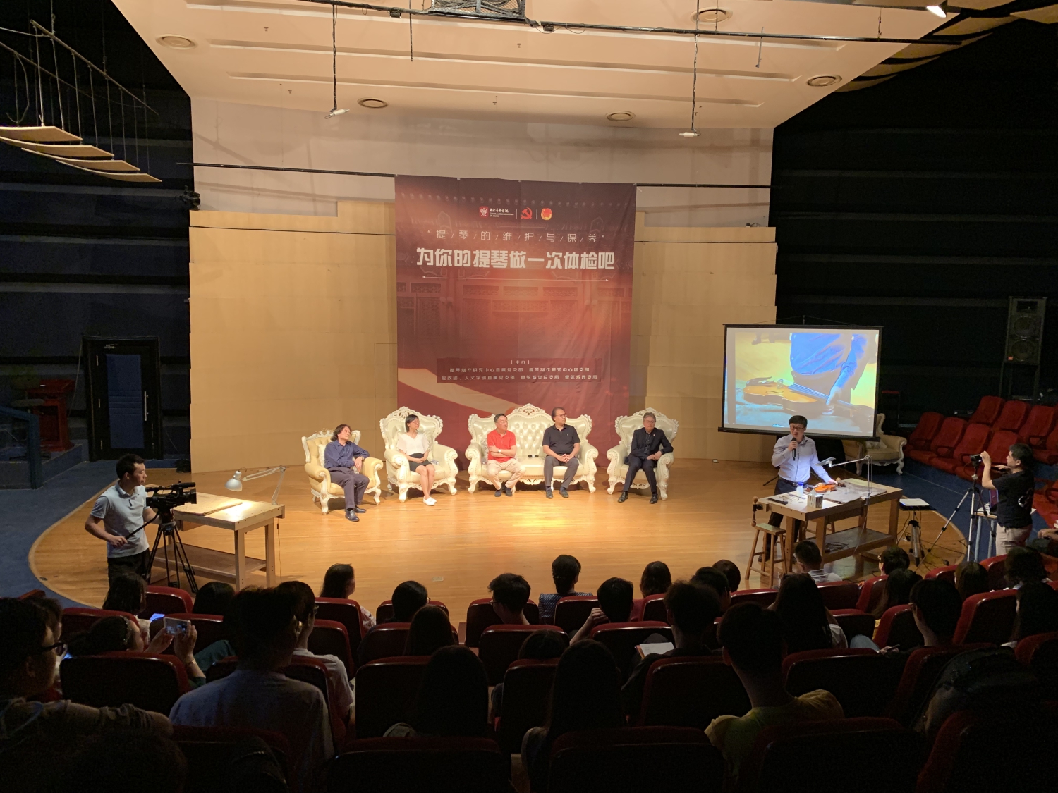 高老师首先从提琴的维护与保养知识切入,重点分享了关于琴弦的老化与更换、琴码的检查、弦轴的检查与微调等三方面内容。逯翔老师侧重于提琴琴箱修复问题的诊断,对于琴箱的开胶开裂、腮托的安装位置给予了重点分享。陈婷老师专门讲解了提琴油漆方面的知识。刘崇余老师对于现场观众呈上的琴弓给予了充分的意见与建议。管弦系系主任童卫东老师亲自上场,饶有兴趣地参与了讲座的访谈与互动。
