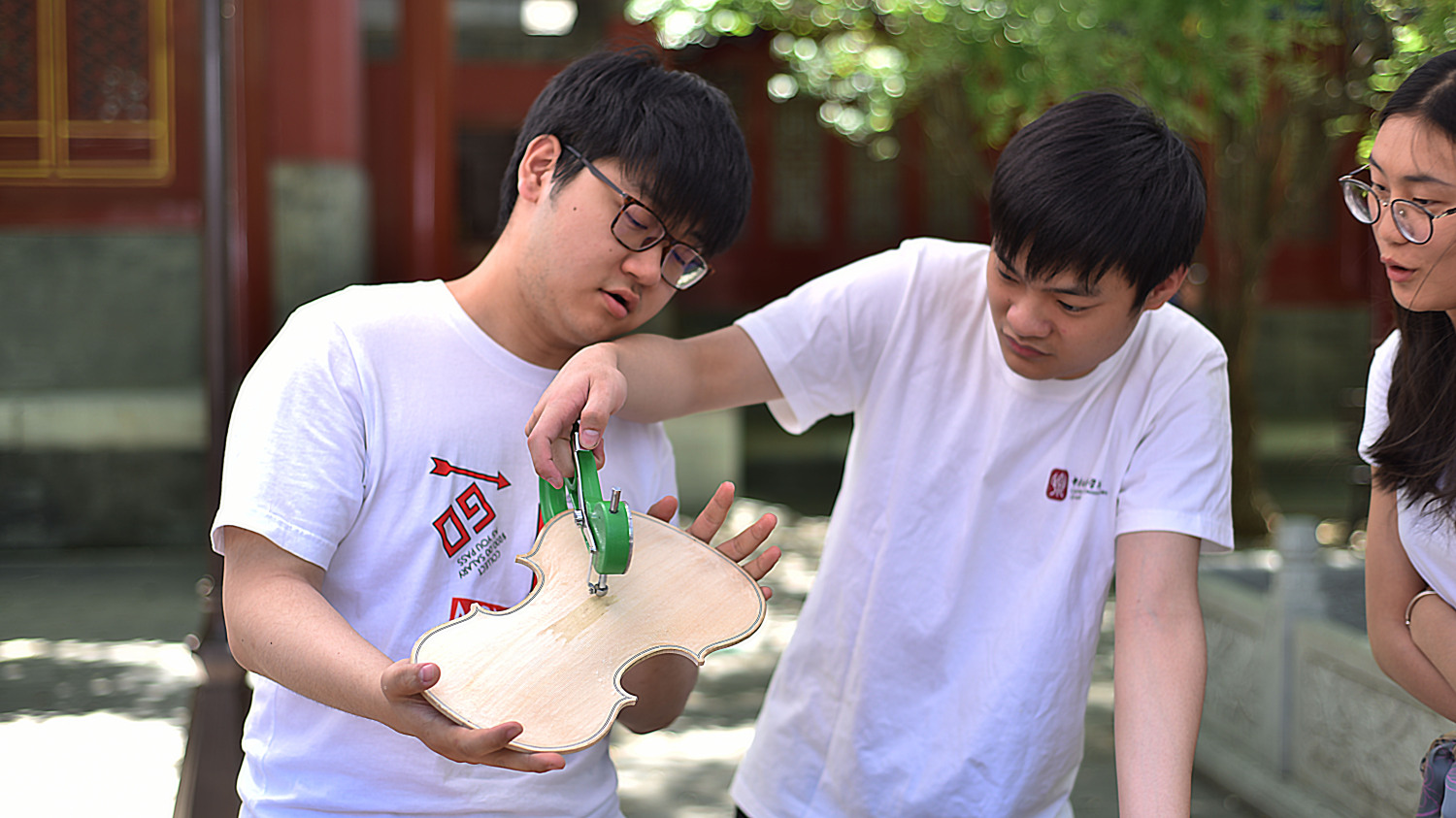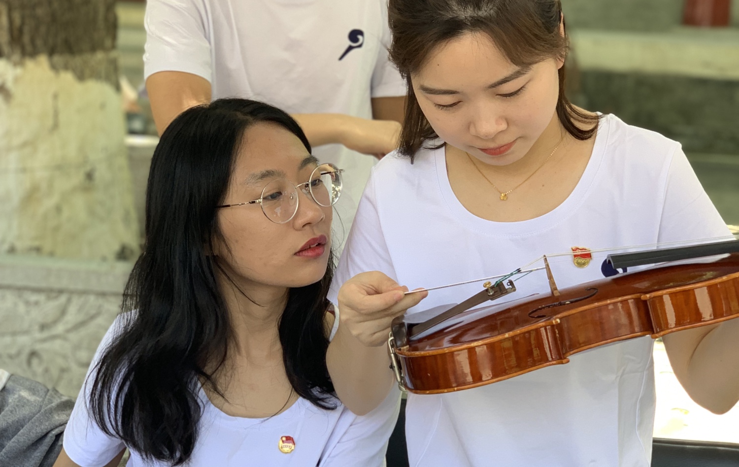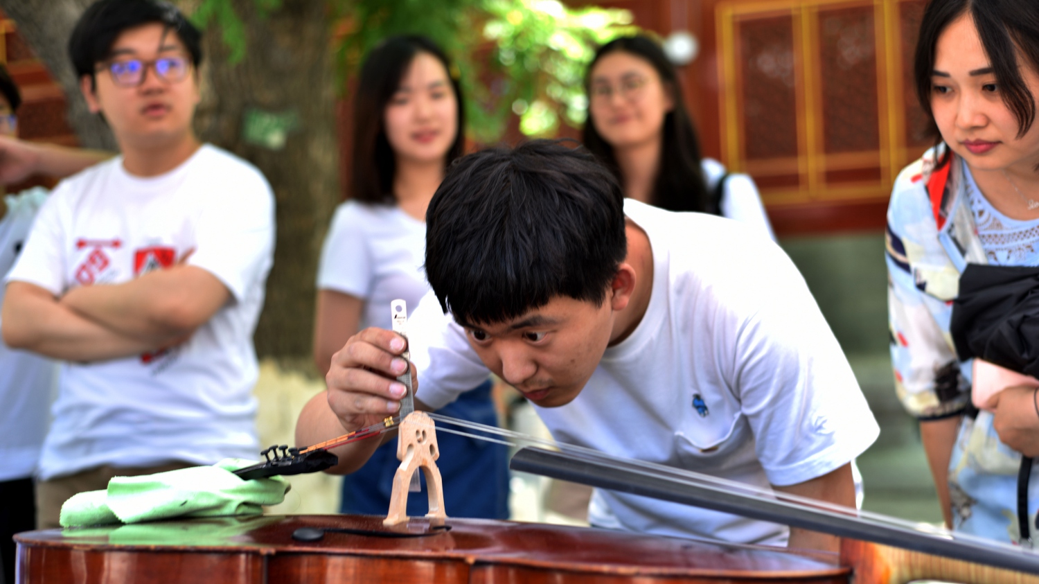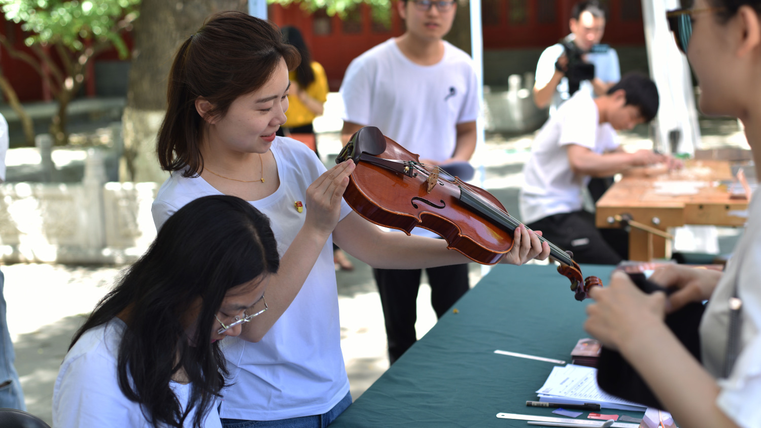 中午时分,学校室外大屏幕滚动播出本次活动的宣传片,展示了提琴制作研究中心(以下简称“中心”)师生们的日常教学与工作。宣传片细腻生动感人,其中的提琴演奏者是来自中心二年级的同学马小淅,演奏用琴来自中心青年学生手工制作,音乐由KY开元作曲系电子音乐录音艺术的研究生帮助录制完成。悠扬的琴声响彻校园,为活动增添了亲切之感。位于学校王府院广场,来自中心的党团青年师生为弦乐演奏专业的同学义务诊断提琴健康状况、解答提琴出现的问题,受到了各界的赞誉。前来诊断的同学络绎不绝。
