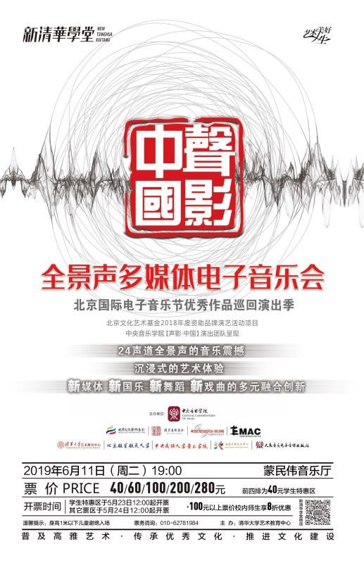 【声影·中国】是北京国际电子音乐节20年来经典作品的汇聚和展演,这是中国电子音乐会第一次走出“象牙塔”,走进高校、面向社会。全景声的跨界演出形式越来越受到观众的喜爱,2019年6月11日,【声影·中国】将在清华大学蒙民伟音乐厅迎来巡演季的最后一场演出。请关注下面的订票信息。6月11日,我们相聚清华大学!