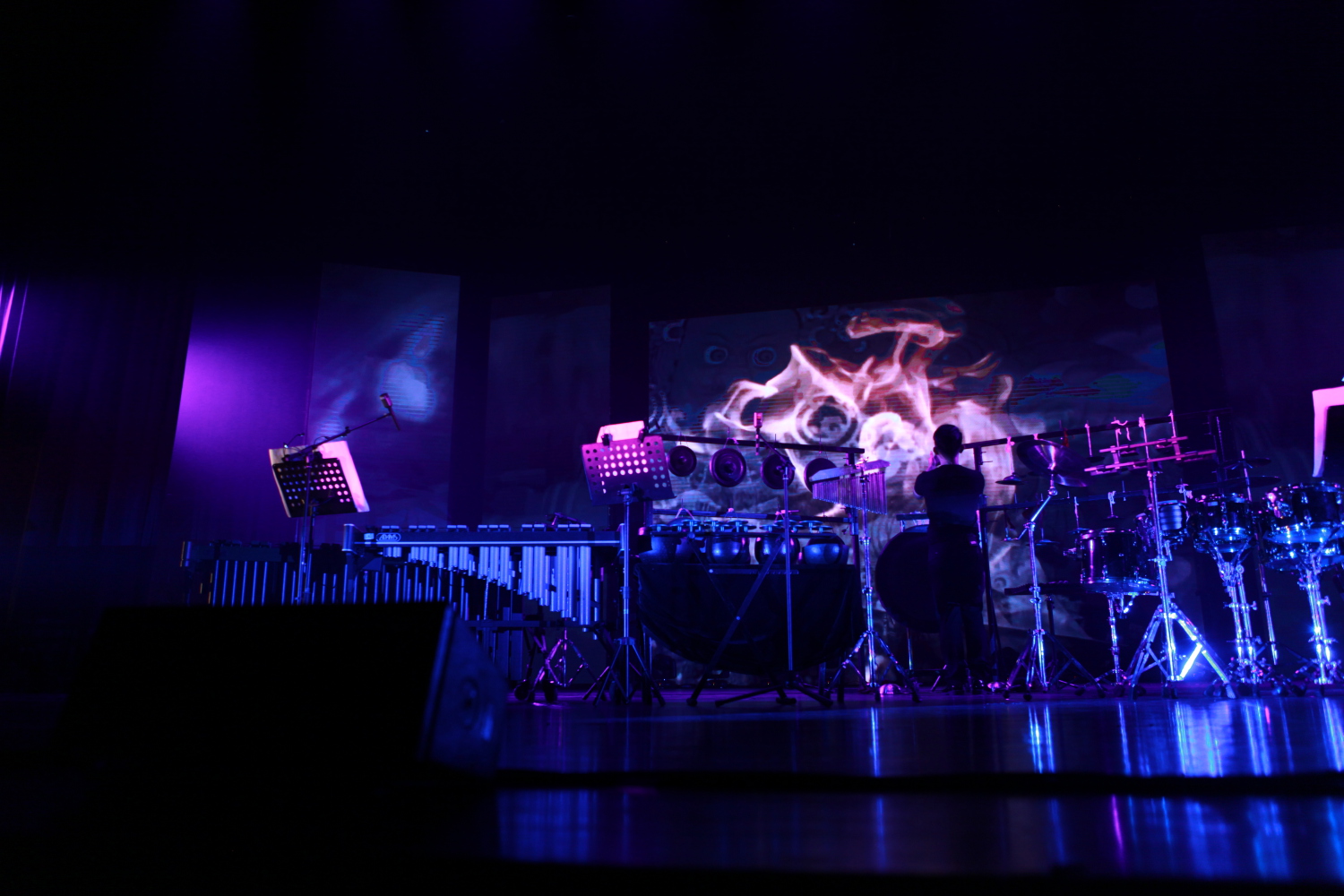 北京国际电子音乐节艺术总监,此次【声影·中国】的总策划人张小夫教授在音乐会前为观众详细解读了“全景声”的声场概念。“全景声”是北京国际电子音乐节演出独有的演出形式,是一个现代化的24声道的“声音扩散”系统,即根据每一个场地的实际情况,在近场、远场、前方、侧方、后方、上层、和顶层等不同维度和层次设计几十个点声源,实现三维全景式的声音投射,为作曲家和电子音乐表演者留了了尽可能多的声音传播和扩散的个性化设计,于此同时,视觉影像采用梯形LED设计配合灯光设计,达到与音乐的完美结合。