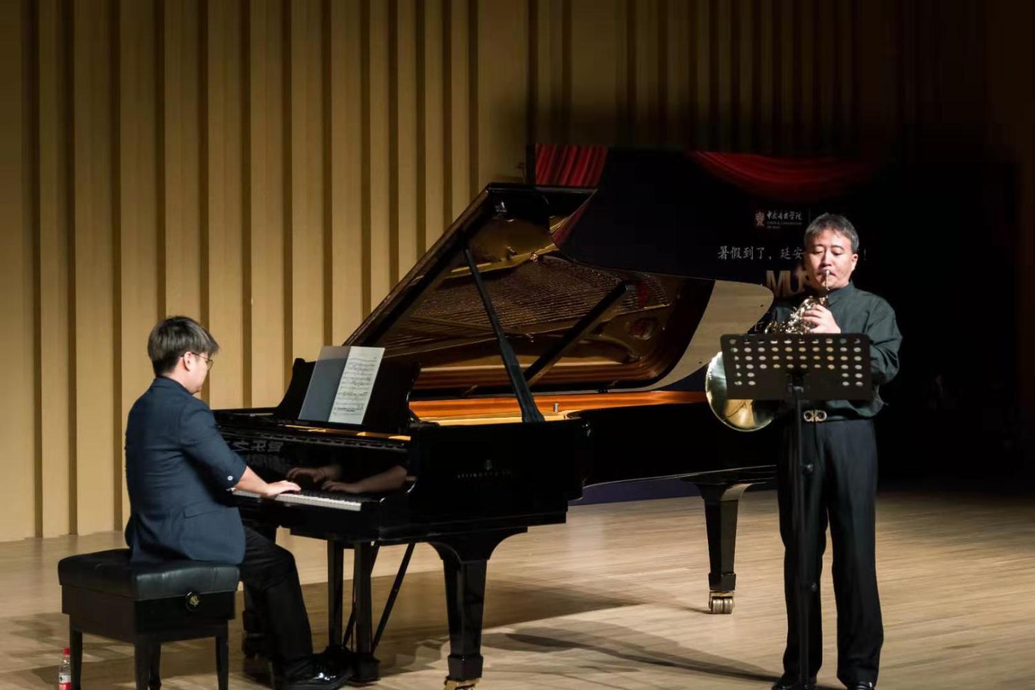 管弦系小号教授、党总支书记陈光教授为大家上演了经典的《小号协奏曲》,旋律时而抒情绵长、时而明快流动,小号音色在辉煌与柔美之间转换,生动呈现出亚美尼亚自然旖旎的风光。