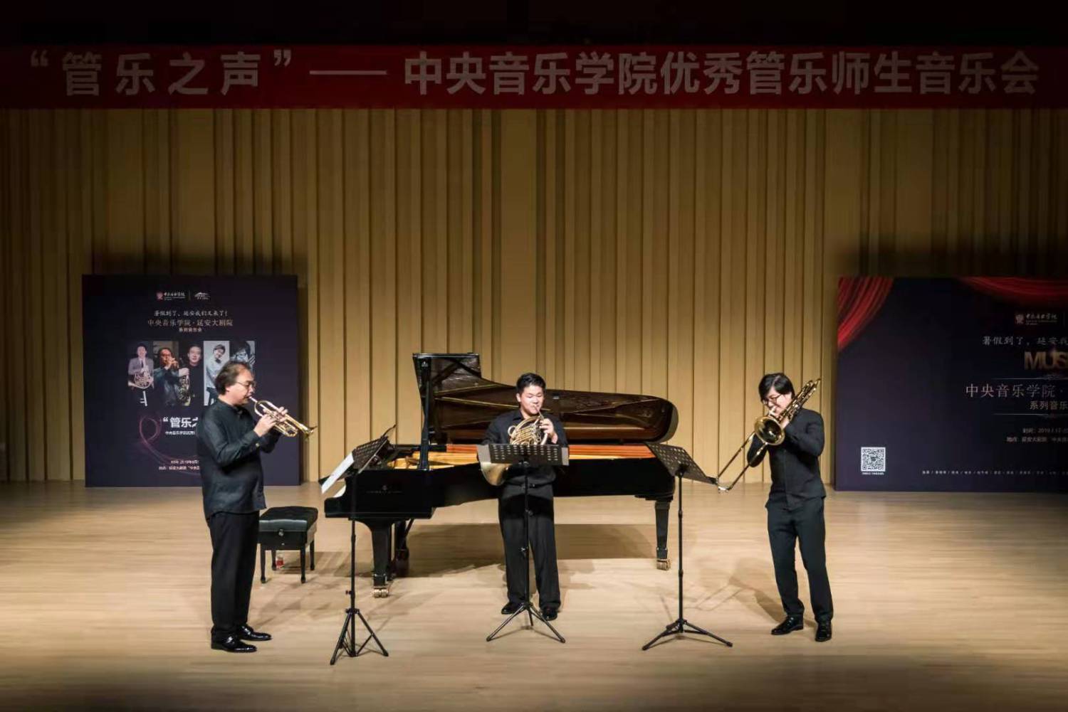 随后,情深如父子般的师徒温泉教授与曾韵合作演奏一曲,画面温暖感人。由小号、圆号、长号组成的铜管三重奏在三位演奏家完美默契的配合演出下,为音乐会奏响尾声。