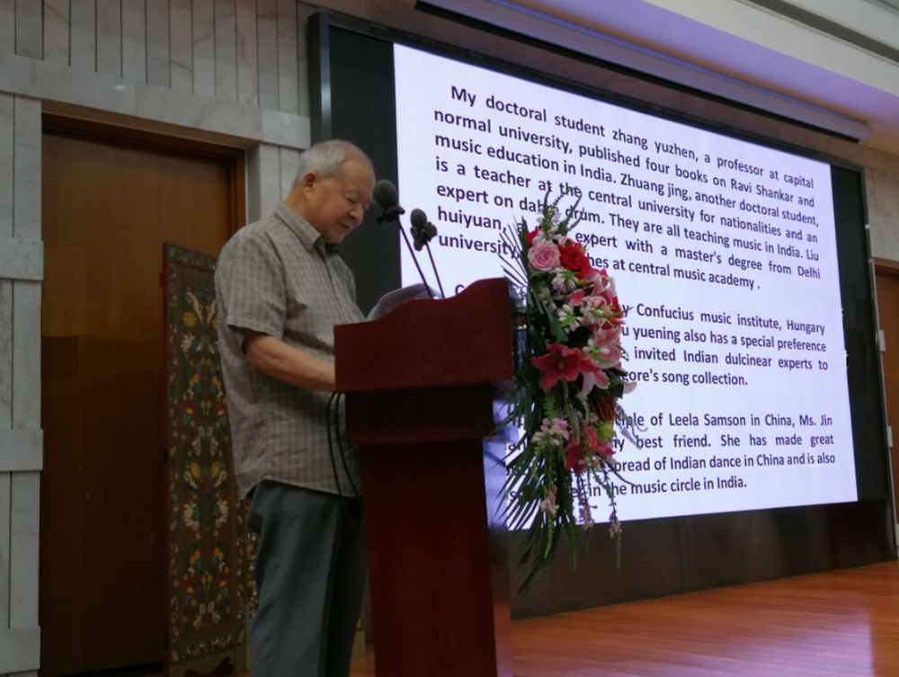 接着,陈自明教授发表致辞,他介绍道:“《印度音乐文化》这本书,是第一部由中国学者独立撰写的印度音乐专著,填补了这方面的空白。全书除序、引言及目录外,共有13章,内容包括:印度音乐产生的文化背景、起源与历史;印度音乐的种类;基本理论;拉格;塔拉;印度的乐器;音乐体裁;民间音乐;著名音乐家;拉格细密画;印度音乐、舞蹈在中国的传播和影响等,约有30余万字”