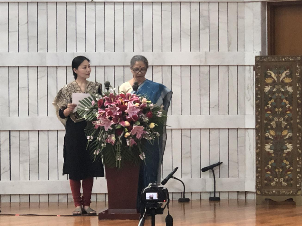 丽拉·桑姆森女士(右1)致辞,由著名婆罗多舞蹈家,丽拉·桑姆森的嫡传弟子金珊珊女士翻译(左1)